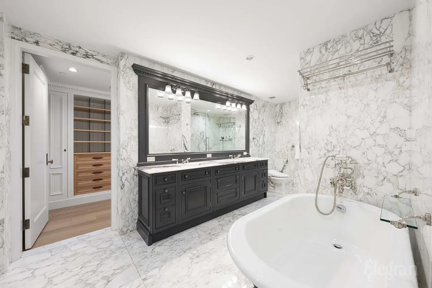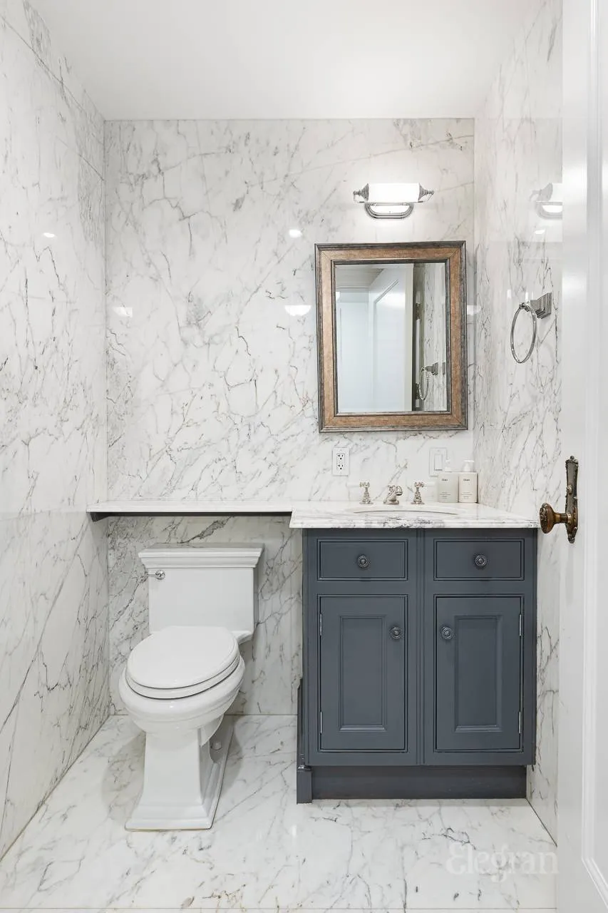 At the heart of the home, the custom Clive Christian kitchen blends beauty and function with Nero Marquina stone countertops, a Mosaic Calacatta marble backsplash, and handcrafted cabinetry — perfect for everyday cooking or entertaining in style. Throughout the residence, period moldings, fine woodwork, and meticulous finishes highlight craftsmanship at its finest. Soundproof Castlewood windows and Quiet Rock insulation create a serene retreat from the city.