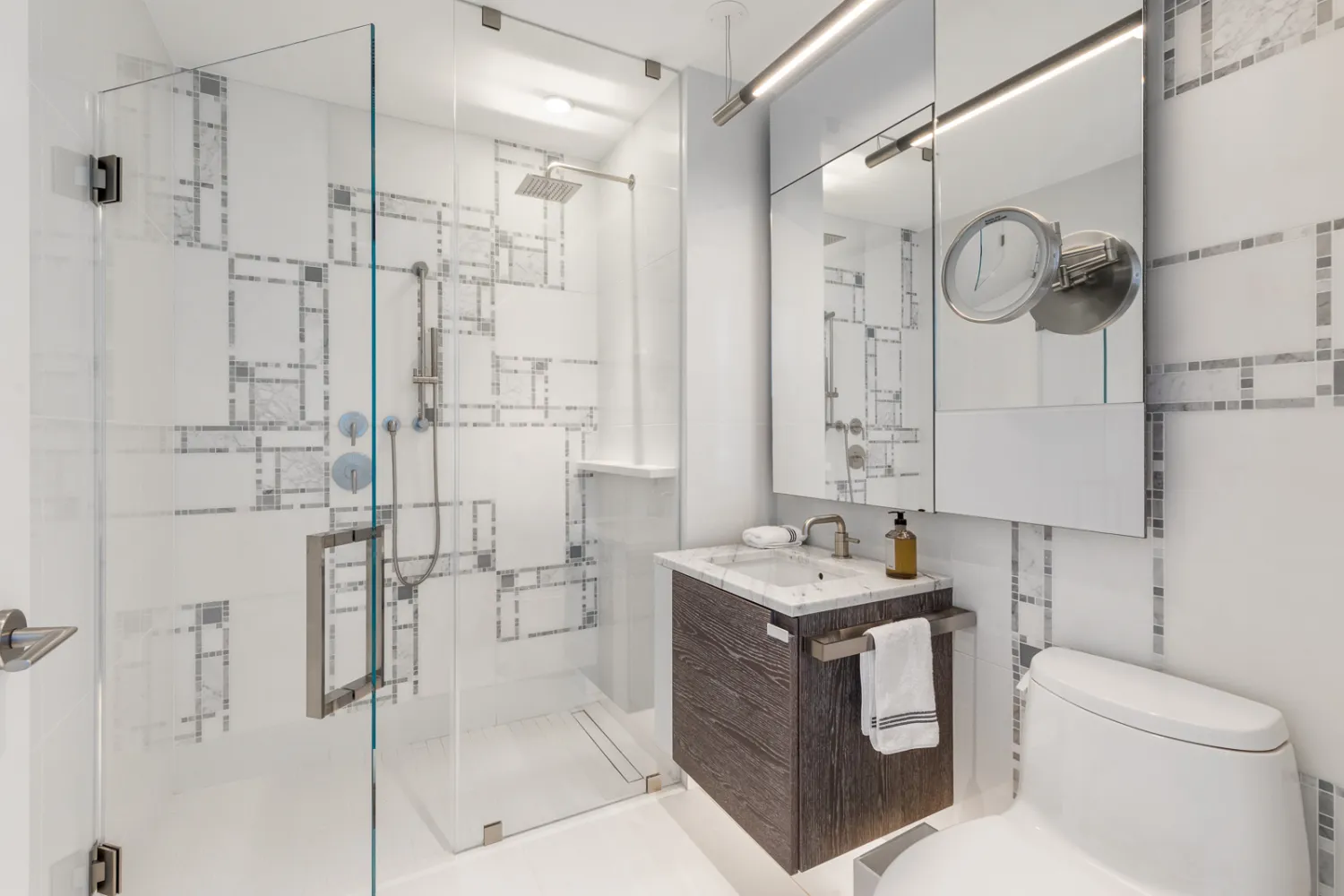 The primary bedroom has a walk-in closet and an immaculate en-suite bathroom with a floating double vanity, imported stone surfaces, custom Waterworks fixtures, a walk-in rain shower, and radiant heated floors. The second bedroom features a full en-suite bathroom, while the third bedroom has easy access to the home's third full bathroom.