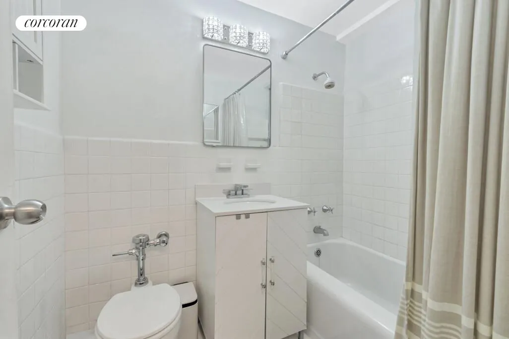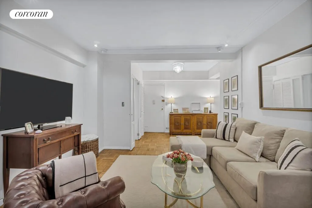 Apt 2G features a gracious entry foyer, updated kitchen and bathroom, 4 closets, oversize windows, and custom lighting. The living / dining room accommodates a large sectional sofa as well as a dining table that can seat 6 people.