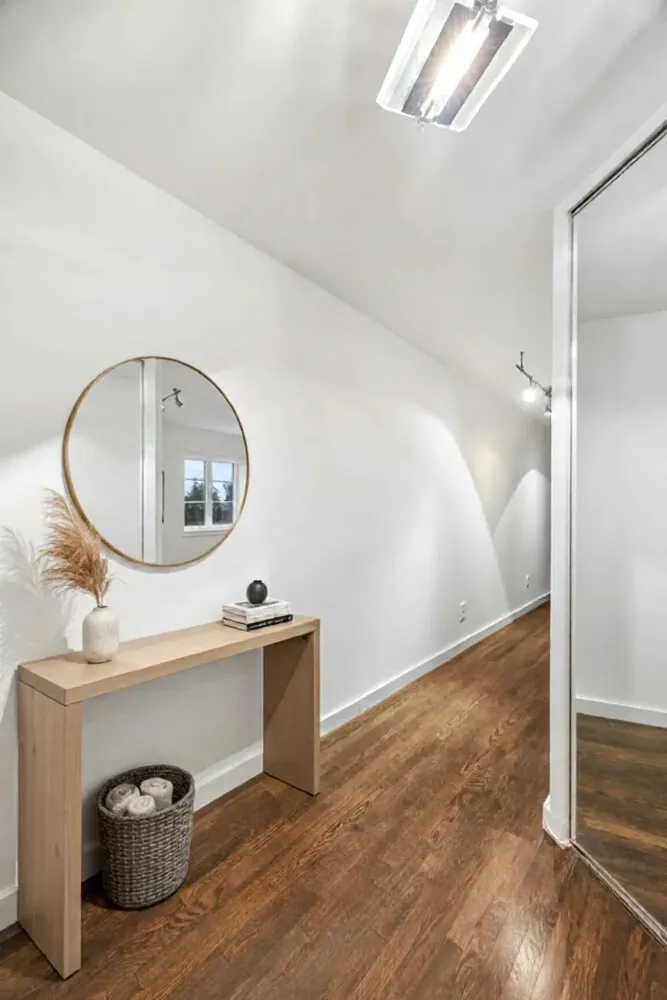 Upon entering this modern apartment, you are greeted with a large entryway and elongated hallway that leads you to the open living space. The large living area features mirrored sliding glass doors separating the living room and bedroom, making the layout feel open and spacious. The open kitchen features high-end appliances, granite countertops, and ample cabinet space. Right off of the kitchen lies a cozy breakfast nook with a built in banquette. The oversized bedroom easily accommodates a king-sized bed plus additional furniture with an abundance of closet space. The bathroom contains a soothing spa-like tub and a glass pedestal sink with quality fixtures. The apartment has climate controlled air conditioning dimmable track lighting, and built-in Sonos speakers throughout.