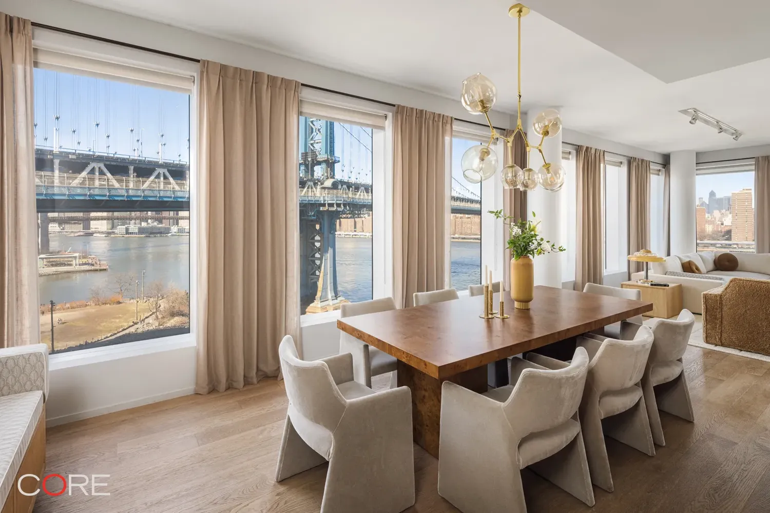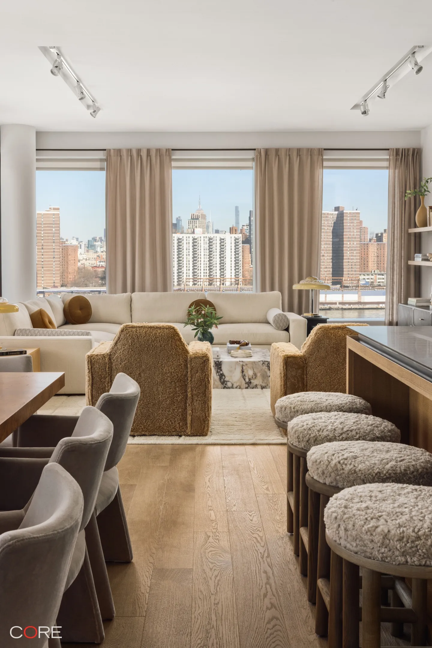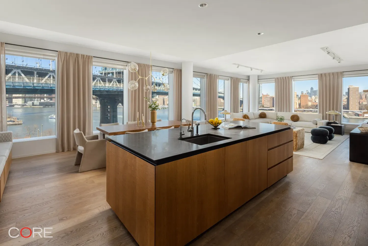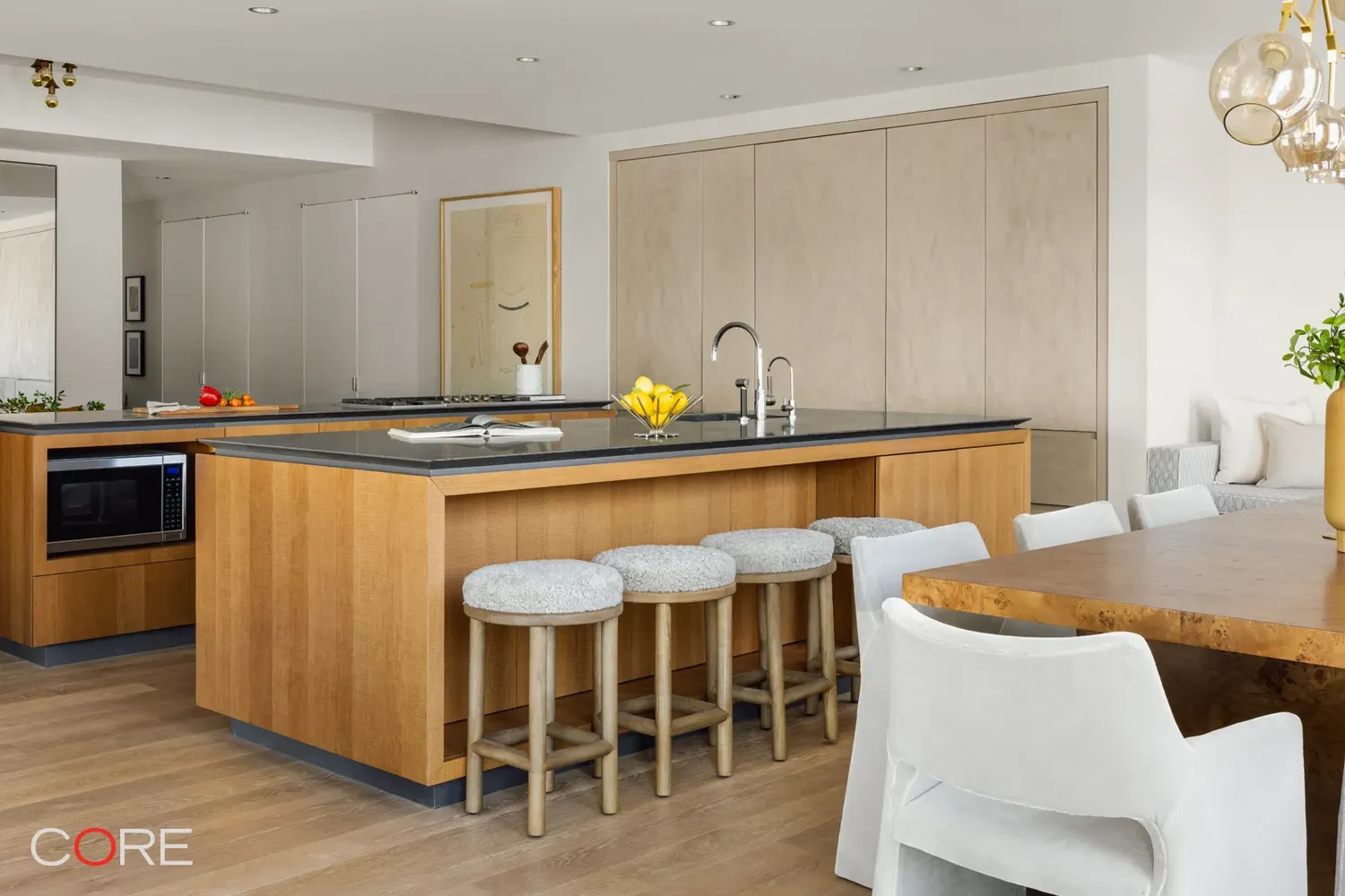 As you enter the 2,486-square-foot space, one is immediately greeted by the breathtaking views, while the grand entry foyer and powder room give way to the expansive living and dining areas. The kitchen is fully equipped with Italian cabinetry by RiFRA, Gaggenau appliances, a Bosch dishwasher, a vented hood, and a wine fridge.