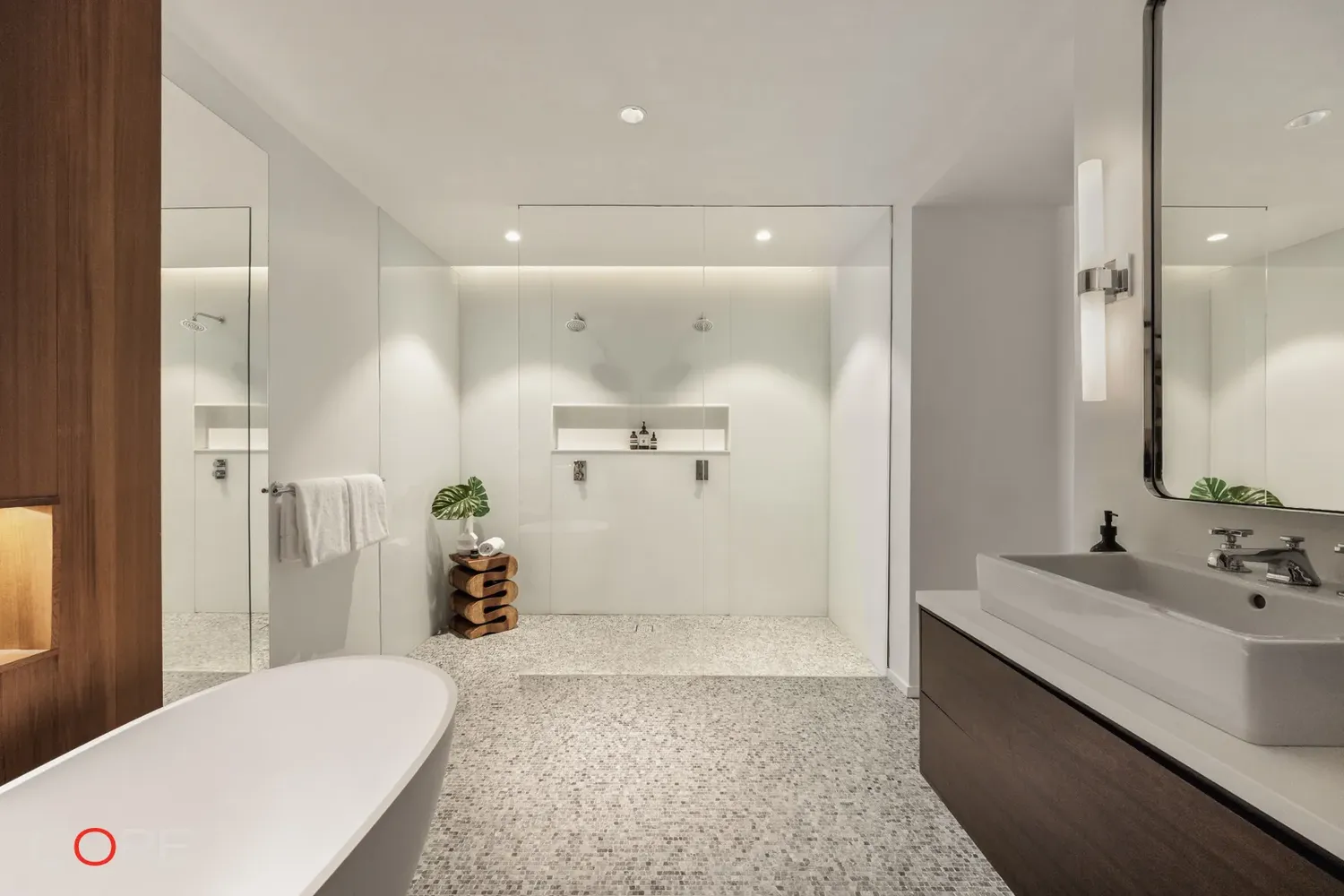 Each bedroom features an en-suite bath, custom closets, and sweeping western-facing views. The master suite is outfitted with a double shower, deep-soaking tub, vanity, and is decorated with stone mosaic floors.