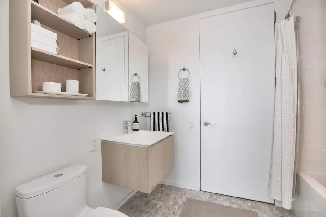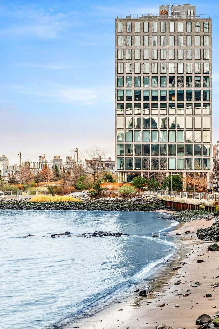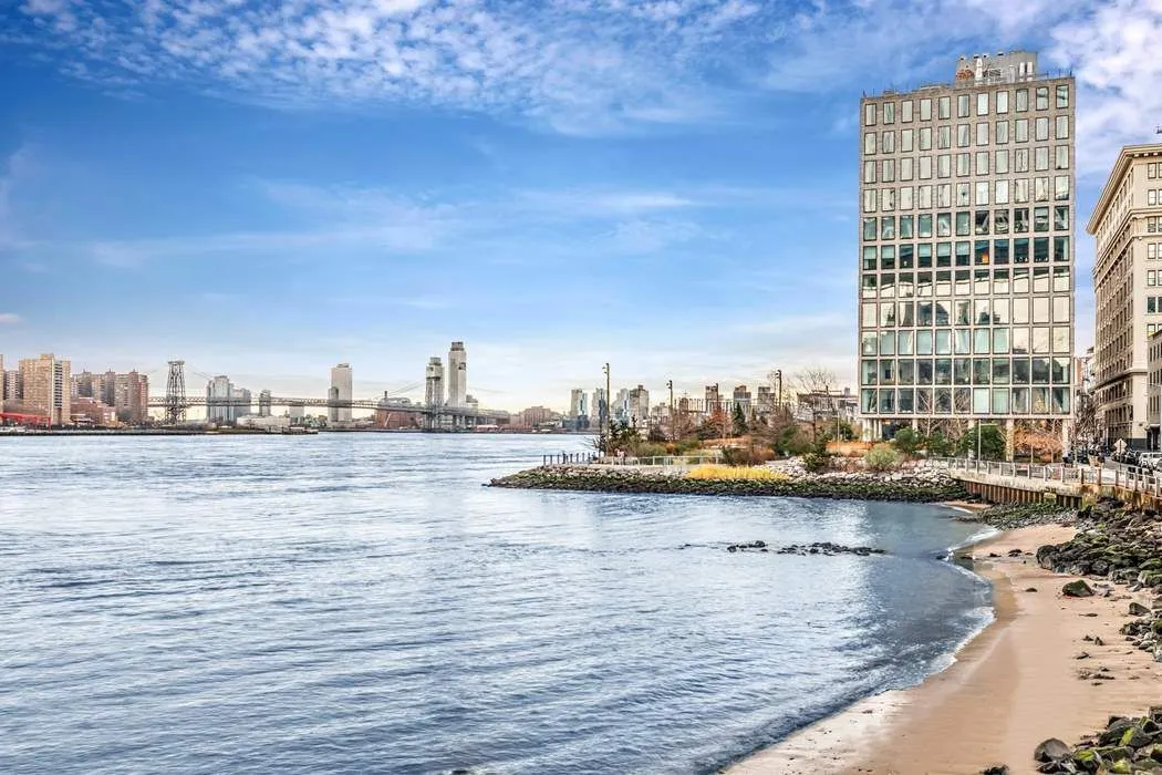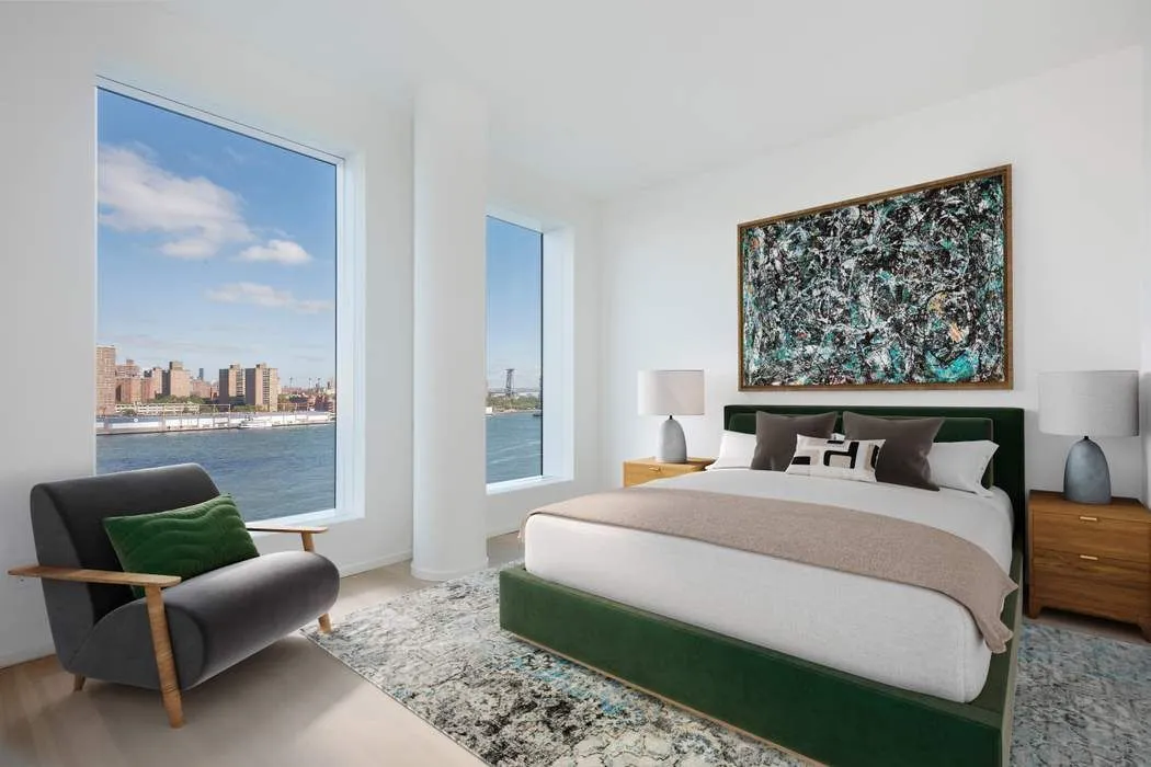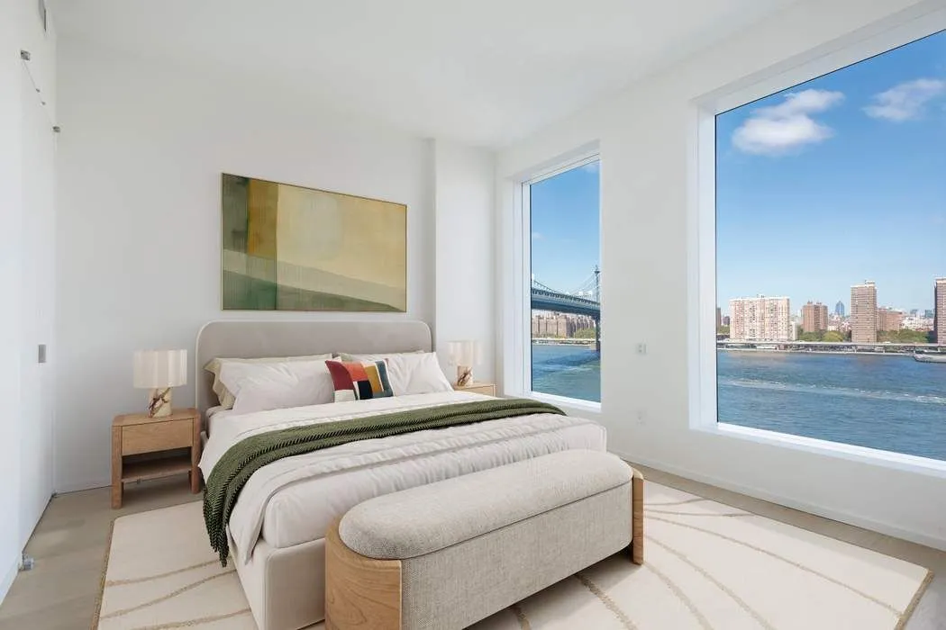 The primary bedroom suite has more than enough space for a king-sized bed and offers stunning views of the East River, Manhattan Bridge, Empire State Building, Brooklyn Bridge Park, and NYC Skyline through its oversized windows. The en-suite bath is accessible through a spacious corridor with a wall of custom closets and an additional dressing area with custom built-in dressers for extra storage. The luxurious bathroom features stone mosaic floors, a double vanity with storage below, a double walk-in rain shower, and a Toto toilet in a separate water closet. The second bedroom includes oversized windows, custom-fitted closets, and an en-suite bath with a soaking tub. This lavish bathroom connects to both the second bedroom and a recently enclosed bonus room that can serve as a work-from-home space, den, media room, or interior sleeping space. This oasis truly offers functionality and versatility to fit your everyday needs.