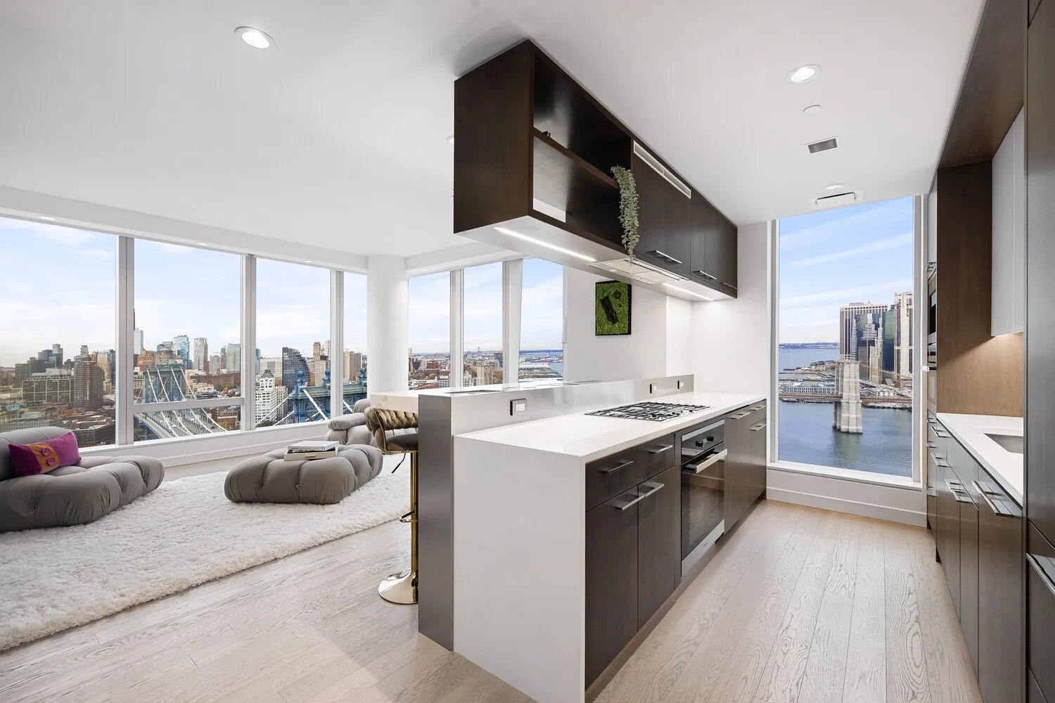Perched perfectly on the 36th floor, Residence 36C is a palatial 1,487 SF corner home offering spectacular triple exposures (South, East & West) and unrivaled panoramic views of the Manhattan & Brooklyn Bridges, the East River, NY Harbor, and the glittering city skyline. This elevated sanctuary captures sunrises over the water and sunsets across Downtown Manhattan, creating an ever-changing, cinematic backdrop throughout the day.