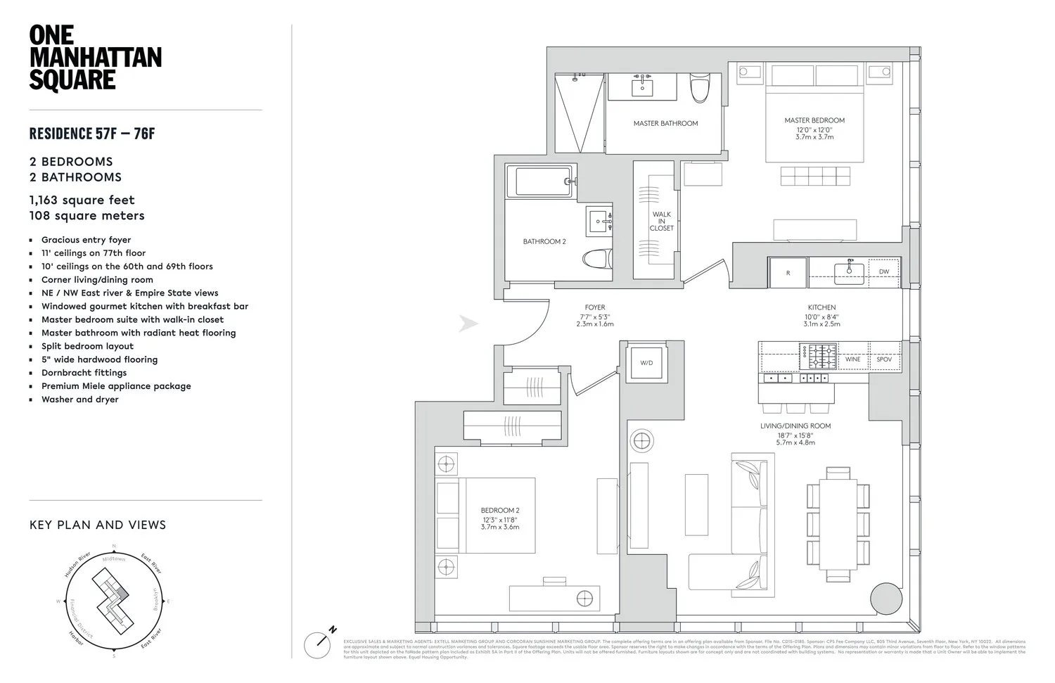 Residence 71F is a 1,163 square foot two bedroom, two bathroom with an open gourmet kitchen and breakfast bar. This spacious corner residence faces South East and North East with views of the city's skyline, Empire State, East River, and Manhattan Bridge. Warm, modern interiors are brought to life by the renowned design team at Meyer Davis Studio. This residence features imported stone and custom finishes, premium Miele appliance package, 5" wide stained oak flooring, master bath with custom wood cabinetry, marble tile walls and mosaic floors with radiant heat, under-mount Wetstyle sink with glass vanity top and Dornbracht polished chrome faucets and a washer and dryer.