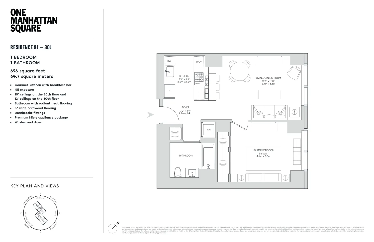 Residence 8J is a 696 square foot one bedroom, one bathroom with an open gourmet kitchen and breakfast bar. This spacious residence faces North East with East River and Williamsburg Bridge views. Warm, modern interiors are brought to life by the renowned design team at Meyer Davis Studio. This residence features imported stone and custom finishes, premium Miele appliance package, 5" wide stained oak flooring, master bath with custom wood cabinetry, marble tile walls and mosaic floors with radiant heat, under-mount Wetstyle sink with glass vanity top and Dornbracht polished chrome faucets and a washer and dryer.