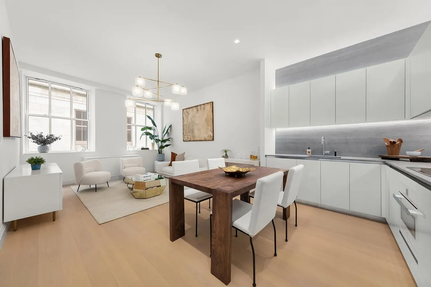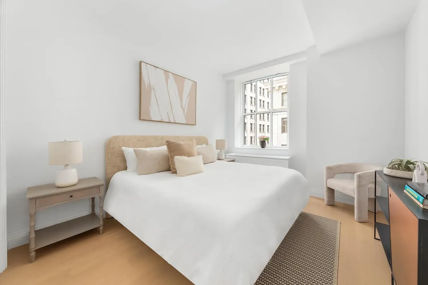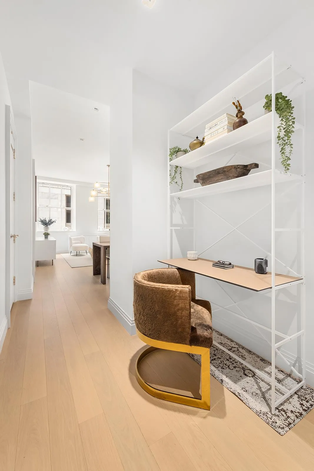 Warm stone primary bathrooms feature a stall shower with thermostatic controls. Mirrored medicine cabinets are integrated with LED lighting and Bianco Dolomite marble surround. The building’s one-of-a-kind residences maintain the integrity and character of the 1930s scale, a modern take to art deco detailing, and boast ceiling heights over ten feet throughout with wide-plank French Oak hardwood floors underfoot.