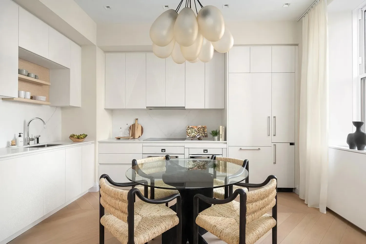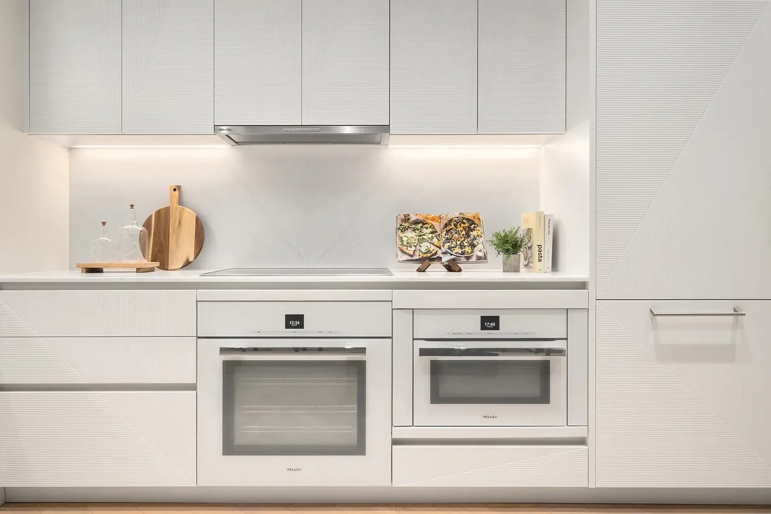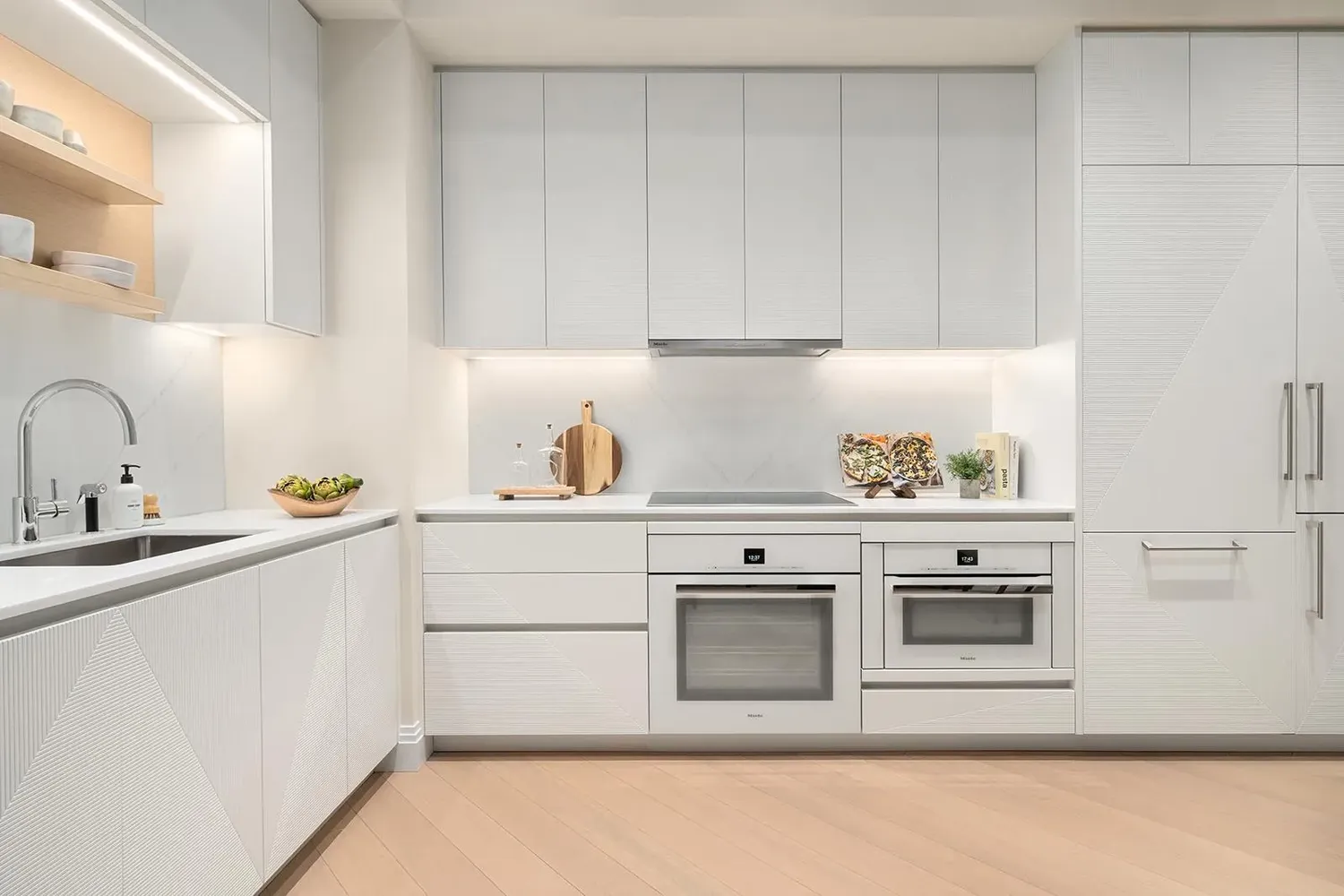 Sleek and functional, the kitchen pairs custom Aran Cucine cabinetry with integrated Miele appliances, satin-nickel accents, and refined natural stone surfaces. Wide-plank French Oak hardwood floors run throughout the residence, reinforcing the home’s sophisticated, contemporary aesthetic.