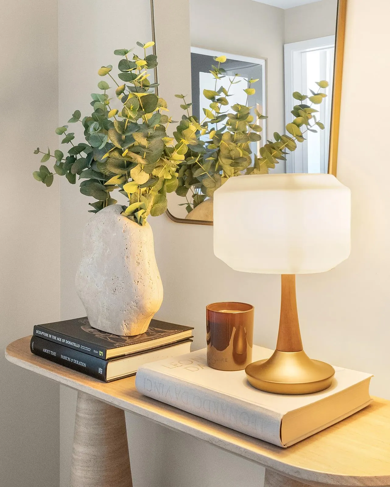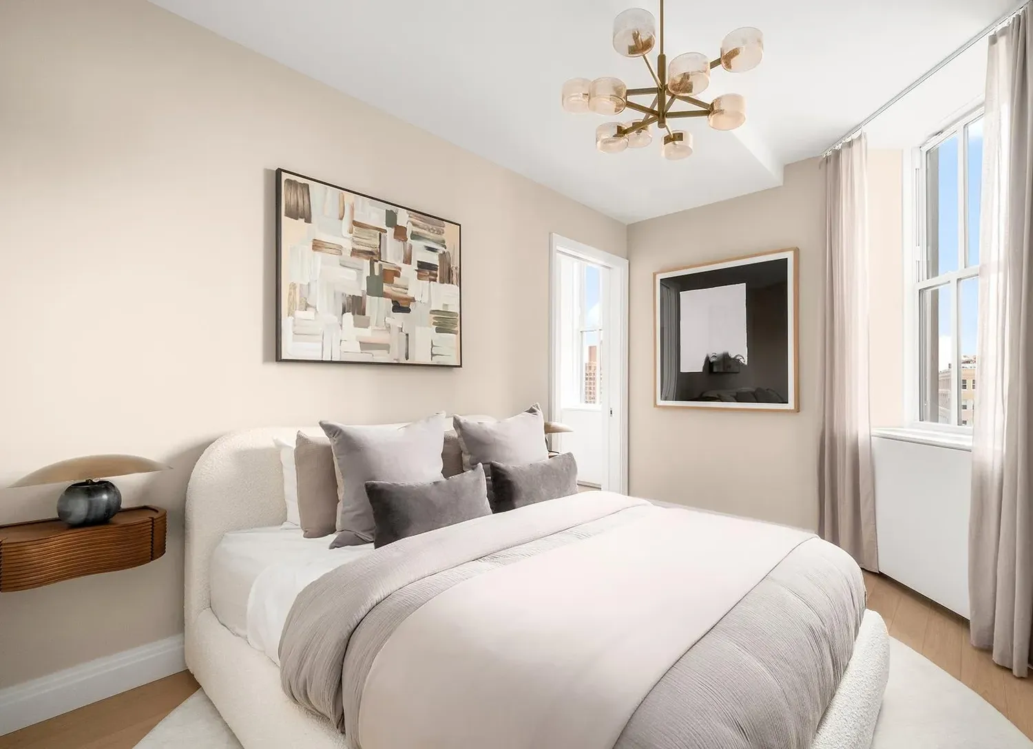 The south-facing bedroom includes an oversized walk-in closet and a serene, stone-finished bath designed for everyday comfort. The spa-inspired primary bath is appointed with honed natural stone finishes and refined fixtures, while a separate powder room adds everyday convenience for guests. In-unit washer/dryer and a gracious entry foyer complete this beautifully composed Financial District residence.