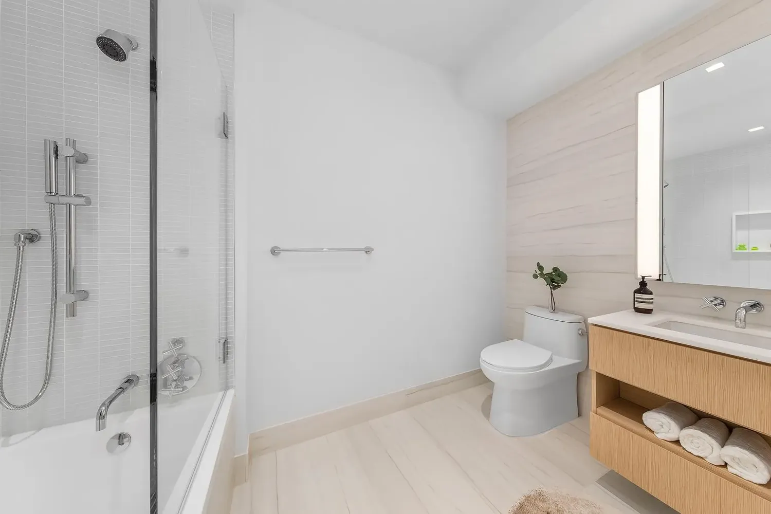 Warm stone primary bathrooms feature large soaking tubs with thermostatic controls. Mirrored medicine cabinets are integrated with LED lighting and Bianco Dolomite marble surround. The building’s one-of-a-kind residences maintain the integrity and character of the 1930s scale, a modern take to art deco detailing, and boast ceiling heights over ten feet throughout with wide-plank French Oak hardwood floors underfoot.