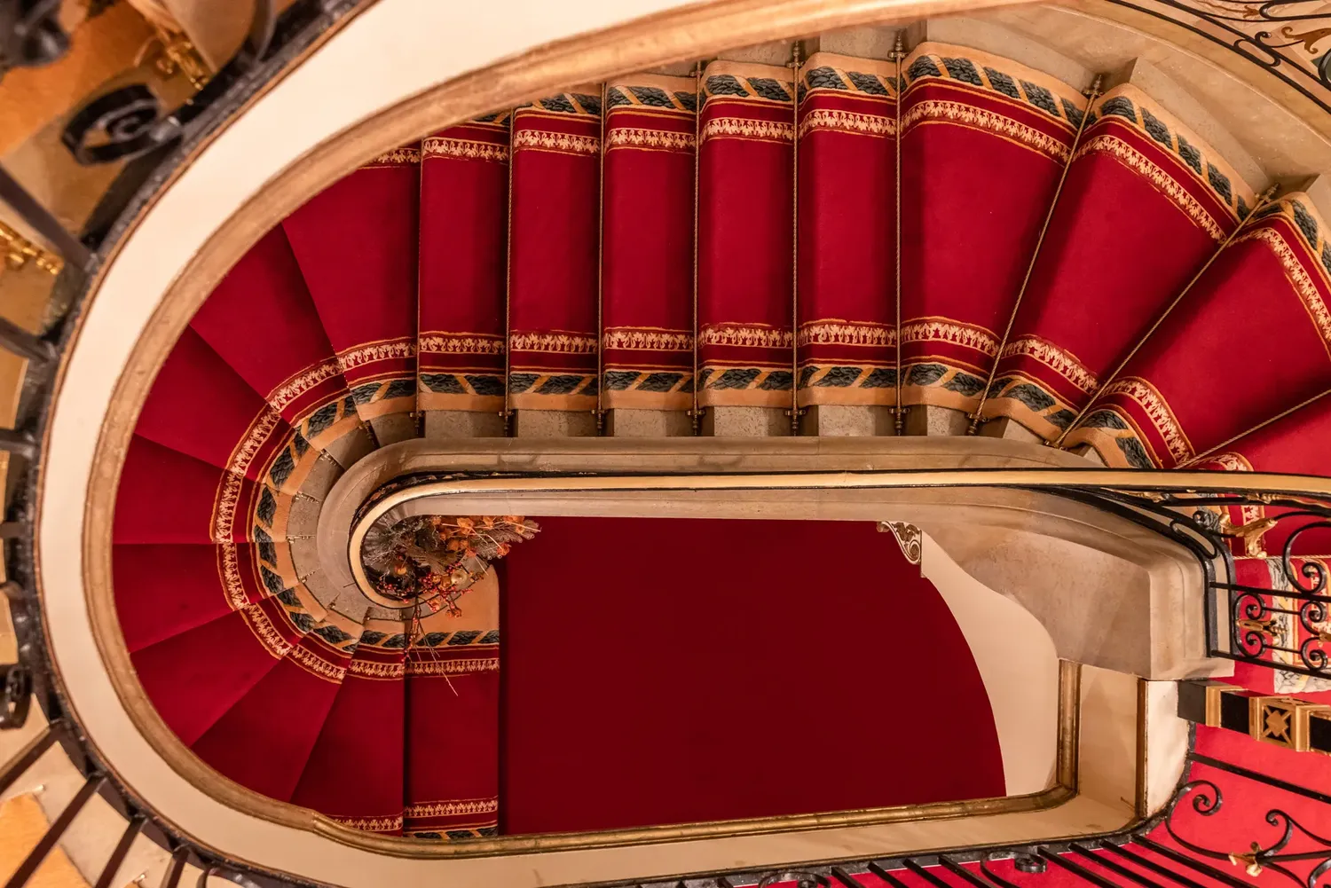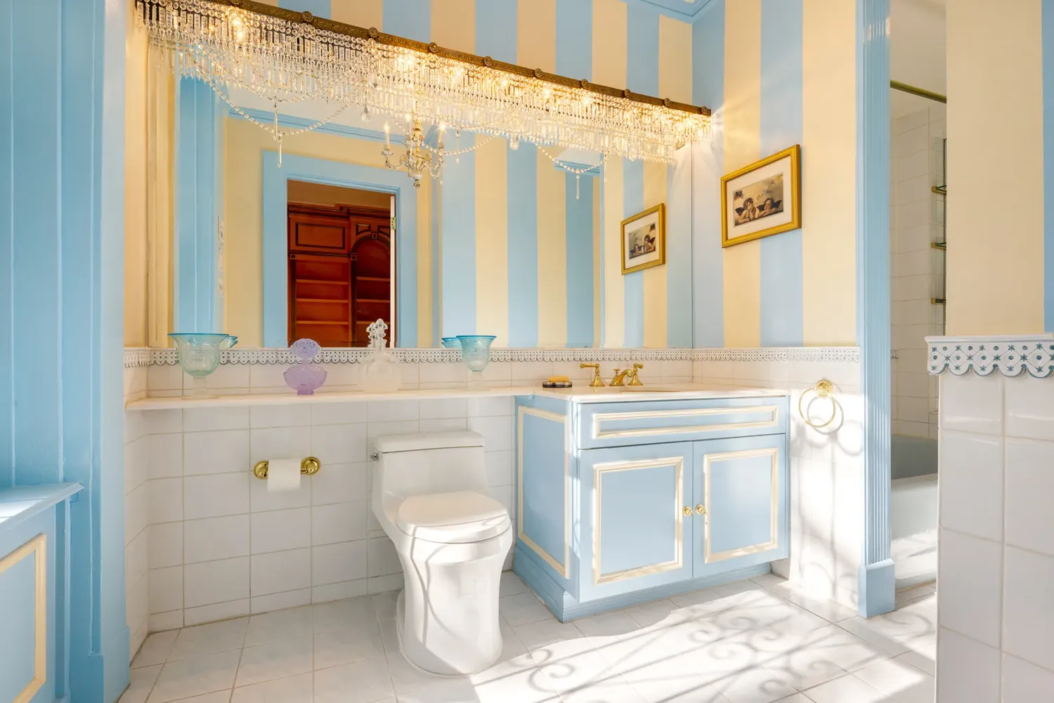 Occupying the entire third floor, the primary suite consists of an enormous, south-facing bedroom graced by a meticulously restored mural, and a private terrace accessed through three sets of charming French doors. An ensuite bathroom clad in pink Onyx marble and gold hardware boasts a double sink, oversized soaking tub, mirrored vanity and separate water closet. Across the floor, a bold, exotic office swathed in leopard print boasts an Onyx and gold fireplace and sits next to an oversized walk-in closet.