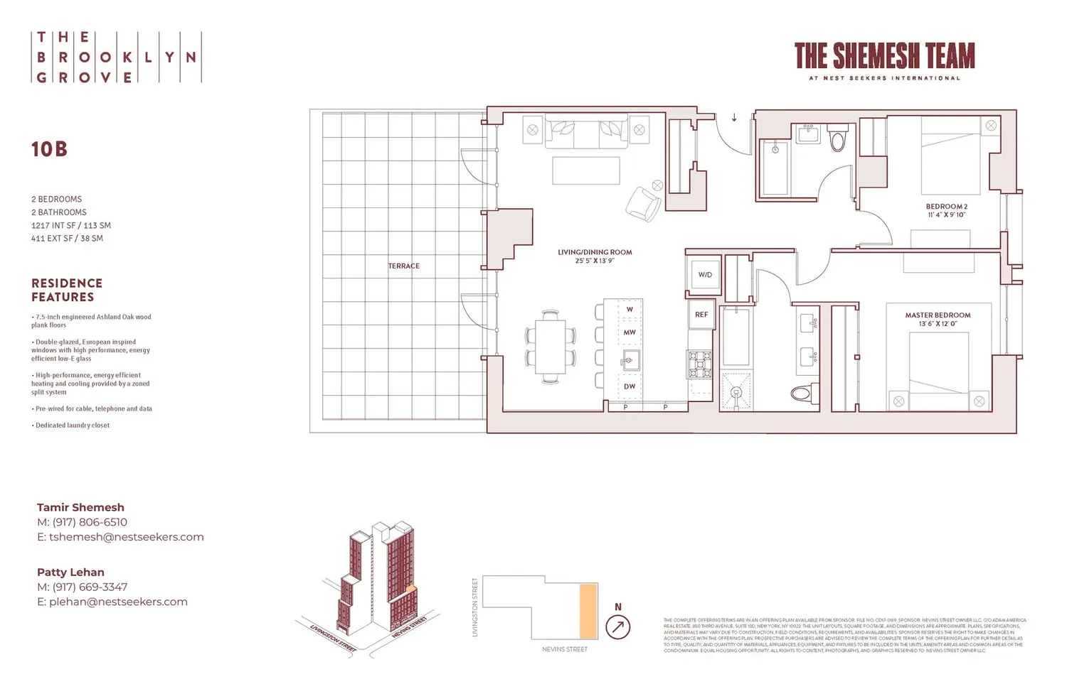 Welcome to Residence 10Β at Τhe Brooklyn Grove. Τhis spacious 2-bedroom, 2-bath home offers 1,211 square feet of thoughtfully designed interior space, complemented by an exceptional 411-square-foot private terrace with open southern exposure—perfect for indoor-outdoor living and entertaining. Sunlight pours into the expansive living and dining area through oversized windows, highlighting the home’s impressive 11-foot ceilings and open layout. Additional conveniences include an in-unit washer and dryer and generous storage throughout. Designed by ODA New York, the interiors blend organic materials with refined finishes. Wide-plank oak flooring runs throughout, while the kitchen features custom rift oak cabinetry, Caesarstone countertops, a Taj Mahal stone backsplash, and antique brass hardware. The spa-like bathrooms are elegantly appointed with Santa Marina stone tile, Waterworks fixtures, and custom oak vanities with Fior di Bosco countertops. The Brooklyn Grove is a full-service luxury condominium located in the heart of Downtown Brooklyn. Its distinctive fac¸ade and serene, design-forward lobby set the tone for a building that offers both sophistication and comfort. Residents enjoy a full suite of amenities, including a 40-foot indoor pool, state-of-the-art fitness center with yoga studio, residents’ lounge with 22-foot ceilings, fireplace, and screening area, as well as a beautifully landscaped rooftop with dining areas and BBQ grills. Additional amenities include a private dining room, children’s playroom, pet spa, parking, bike storage, private storage, and a package room with cold storage. Ideally situated near premier dining, shopping, and transportation, The Brooklyn Grove offers a seamless blend of luxury and convenience.