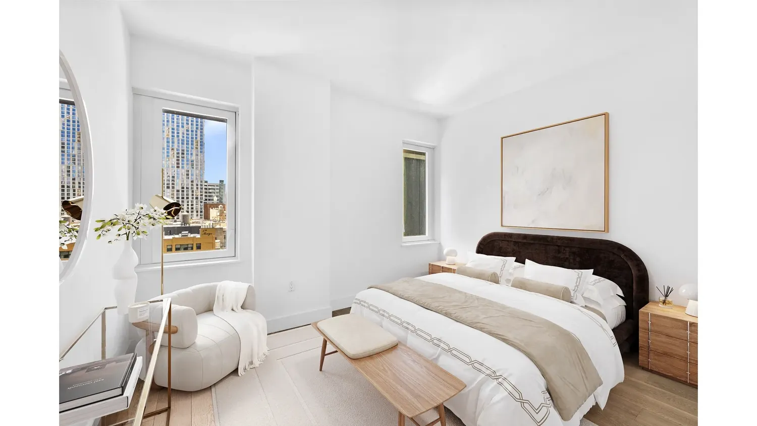 Spanning approximately 713 square feet, this west-facing one-bedroom features a thoughtfully designed open layout. Wide-plank oak floors run throughout, complementing a beautifully appointed kitchen with custom rift-oak cabinetry, concrete-toned Caesarstone countertops, Taj Mahal stone backsplash, and beautiful brass hardware. The bathroom is finished with Santa Marina stone tile, Waterworks fixtures, and an oak vanity topped in Fior di Bosco stone. The king sized bedroom is spacious with ample closet space and central air, dishwasher, and in-unit washer/dryer complete the package.