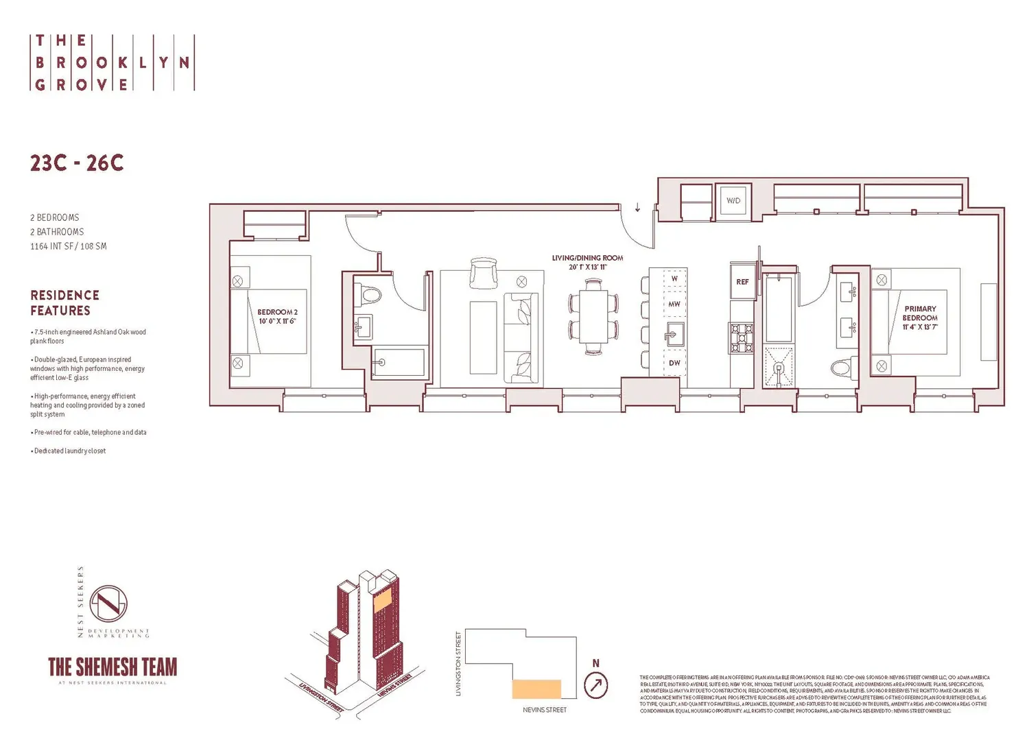 Showing bу appointment. Contact the Εxclusive Agent at Νest Seekers to schedule a tour! Residence 26C at 10 Nevins is a spacious 1164 Square foot 2 Bedroom, 2 Bath home. West-facing, wide open views over Downtown Brooklyn this home features an open plan and luxurious primary suite, secondary bedroom, a large kitchen with dining area and ceilings heights just shy of 11’. With interiors designed by ODA New York, The Brooklyn Grove features a subtle mingling of organic materials and lush textures. Each room offers unexpected touches and welcome surprises including wide plank oak flooring throughout. In the kitchen, custom rift oak cabinetry strikes a distinct contrast against the concrete-hued Caesarstone countertop, Taj Mahal stone backsplash, and antique brass hardware. The elegance of the bathroom is perfected with two types of marble and stone mingling to create a neutral palette that lets the world fall away. A composition of Santa Marina stone tile walls, Waterworks fixtures, and oak vanity with Fior di Bosco countertops complete the bath. A new kind of building has taken root in Downtown Brooklyn. The Brooklyn Grove’s facade makes a statement along Nevins Street, featuring subtly glaze brick and distinctive windows that draw the eye upwards. Reminiscent of an ancient Japanese temple, the inviting attended lobby is rich in thoughtful materiality, with sightlines to Grove Place and beyond. Cutting-edge culture, boutique shopping and the best dining are all located right outside its doors. The Brooklyn Grove’s multi-textured design story continues with the residents’ lounge, located in a soaring space with 22-foot ceilings, a fireplace, pool table and screening area. The rooftop lounge features idyllic views, with lounging and dining areas, and BBQ grills for al fresco gatherings. Wellness amenities include a 40-foot indoor swimming pool and fitness center with yoga room. The private dining room is a place to bring friends and family together for celebratory dinners and drinks. Parking, a children’s playroom, pet spa, package room with cold storage, private storage, and bike storage round out the extensive amenities offering. The complete offering terms are available in an offering plan from Sponsor. File No. CD17-0169.