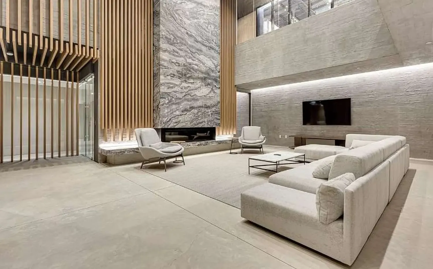 This modern residence showcases impeccably designed interiors by ODA New York, thoughtfully designed with both style and function in mind. The kitchen features custom oak cabinetry, sleek Caesarstone countertops, a Taj Mahal stone backsplash, and elegant antique brass hardware.