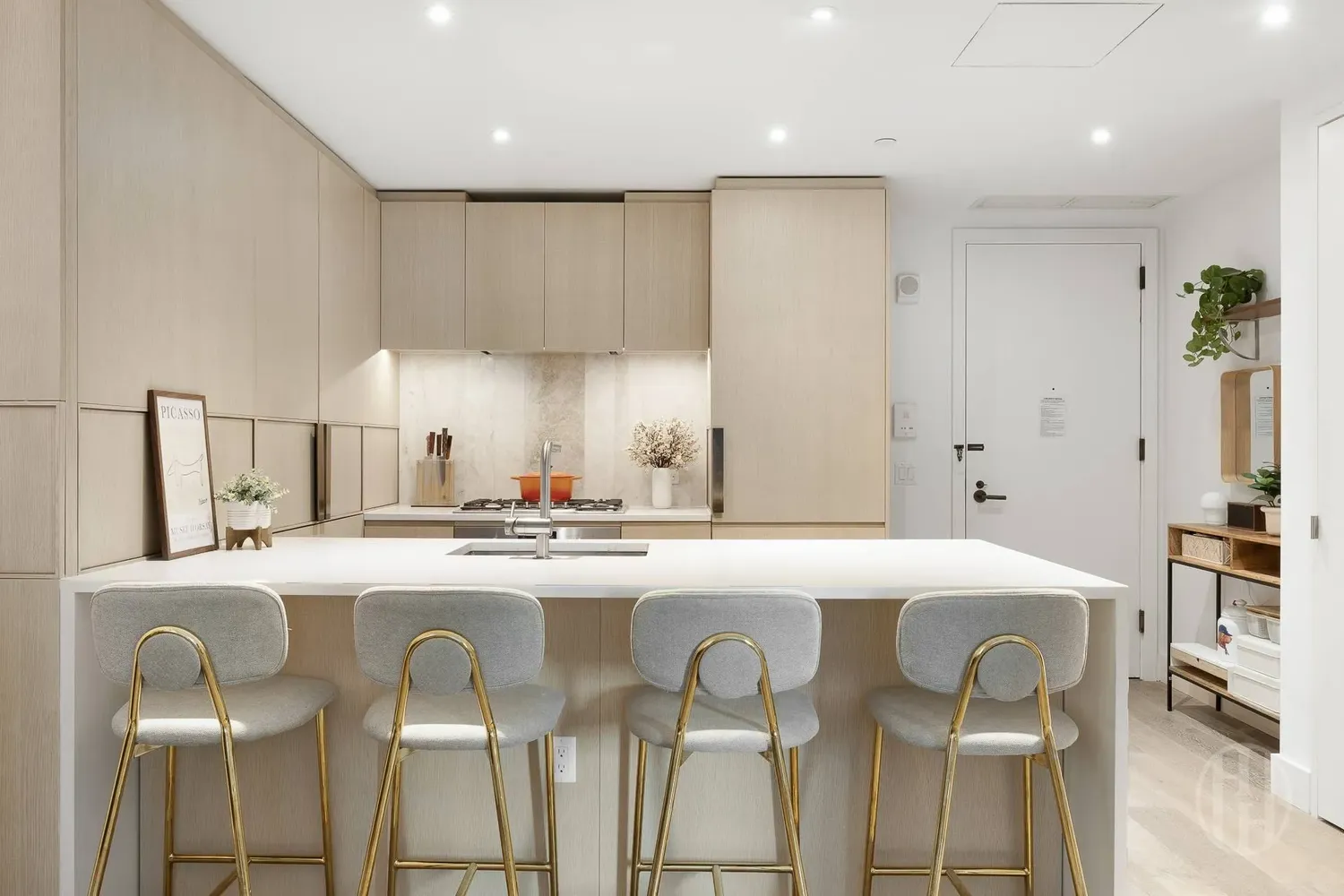 The spa-like bathroom pairs marble and stone finishes with Waterworks fixtures, creating a timeless, elevated feel. Wide-plank oak floors run throughout the home, complemented by generous closet space and the convenience of an in-unit washer and dryer.