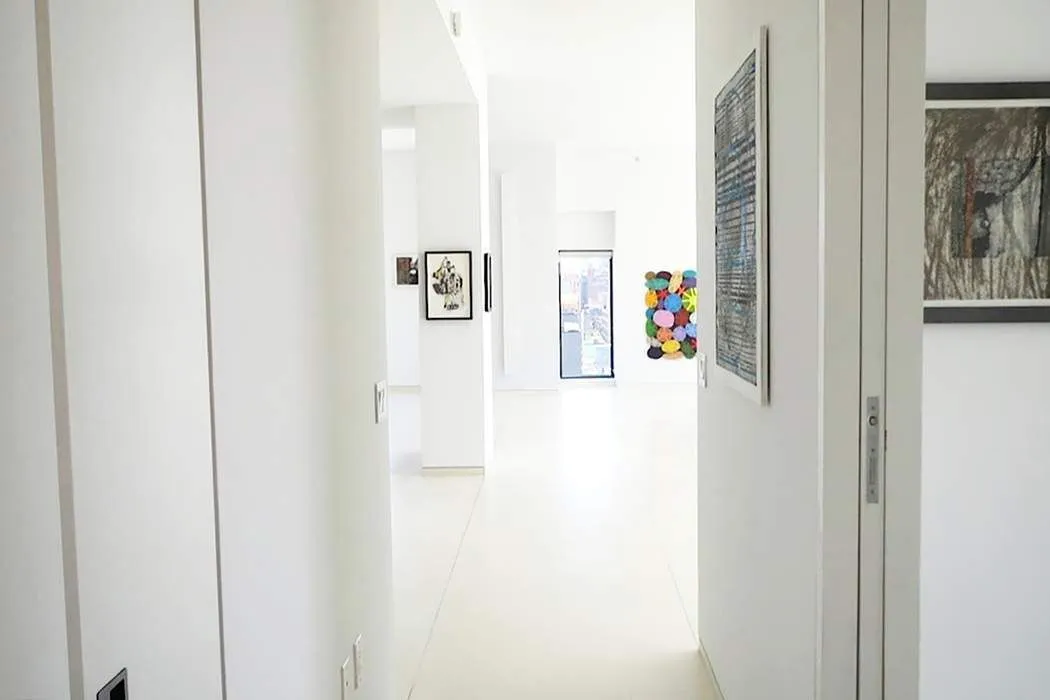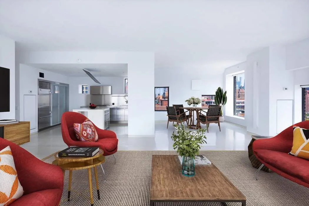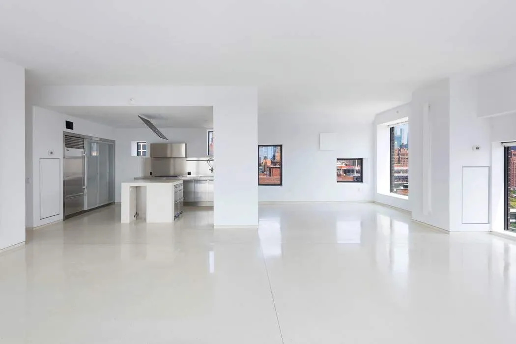 The space of 16C, a high floor consisting of approximately 2650+/-sf with 3 bedrooms, and 3.5 baths, attests to Nouvel's singular achievement with South-West, East and North exposures. The sparse and clean design accentuated by the white terrazzo floors running throughout the unit, provides a gallery like setting in which to accept the unpredictable placement of windows to its east and north with the surprise element of framed "postcard photos" of New York City's skyscrapers, including the Empire State Building and the Met Life Building.