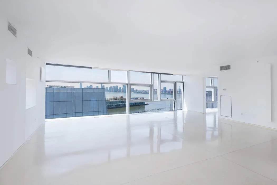 The south-west's continual floor-to-ceiling curtain of glass, measuring approximately 70', extends throughout the Great Room, and 2 of the 3 bedrooms including the primary bedroom. Amazing south views encompass the Statue of Liberty, and the Hudson River to its west, providing a hypnotic appreciation of the ever-changing light and movement of shadow.