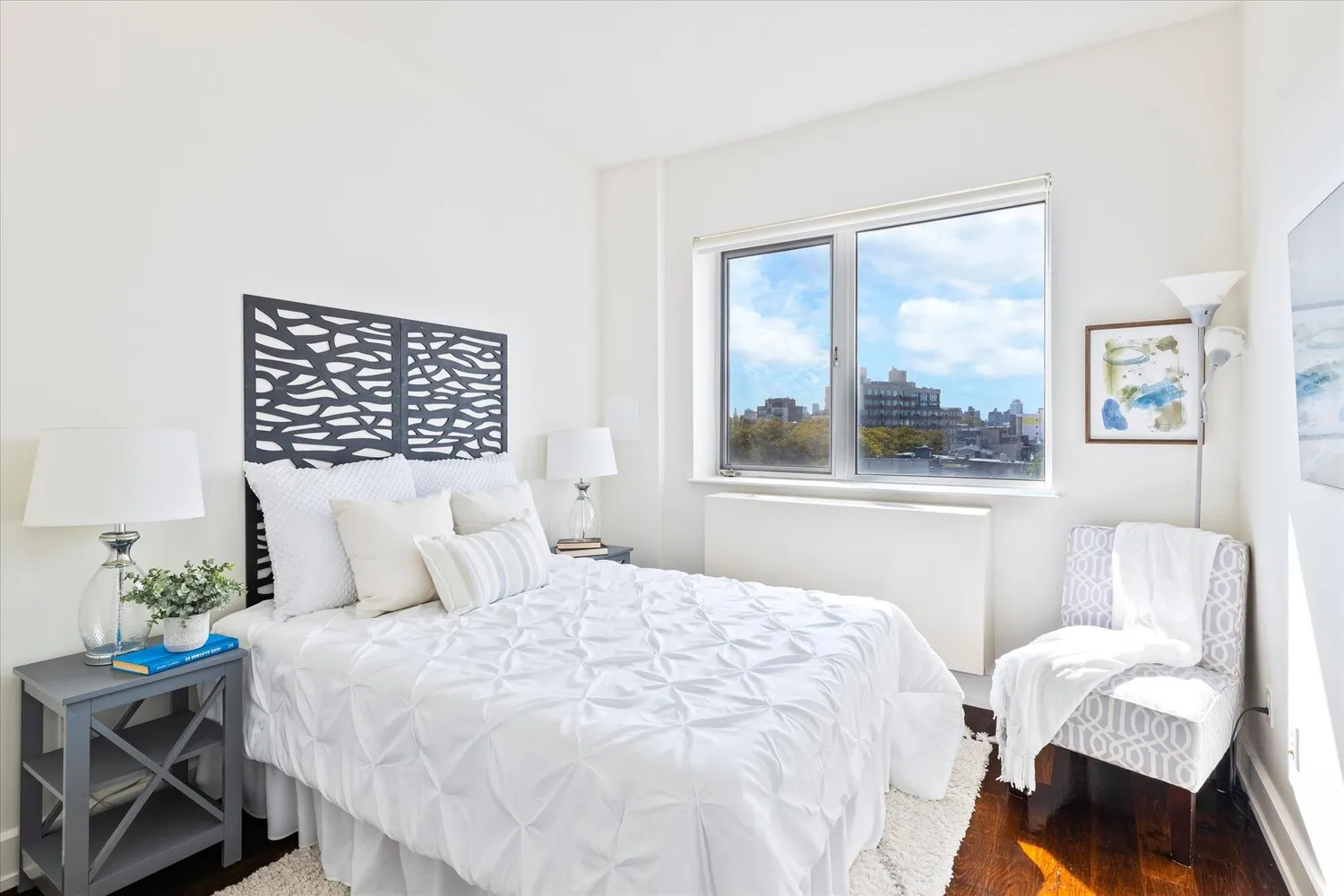 A rare offering at Olive Park: an exceptionally sunny, southwestern-facing penthouse duplex with a private rooftop cabana, large balcony, and unobstructed Manhattan and Brooklyn skyline views. Quietly situated at the back of the building, this corner residence is drenched in natural light all day and overlooks the peaceful meditation garden, offering complete privacy and tranquility.
