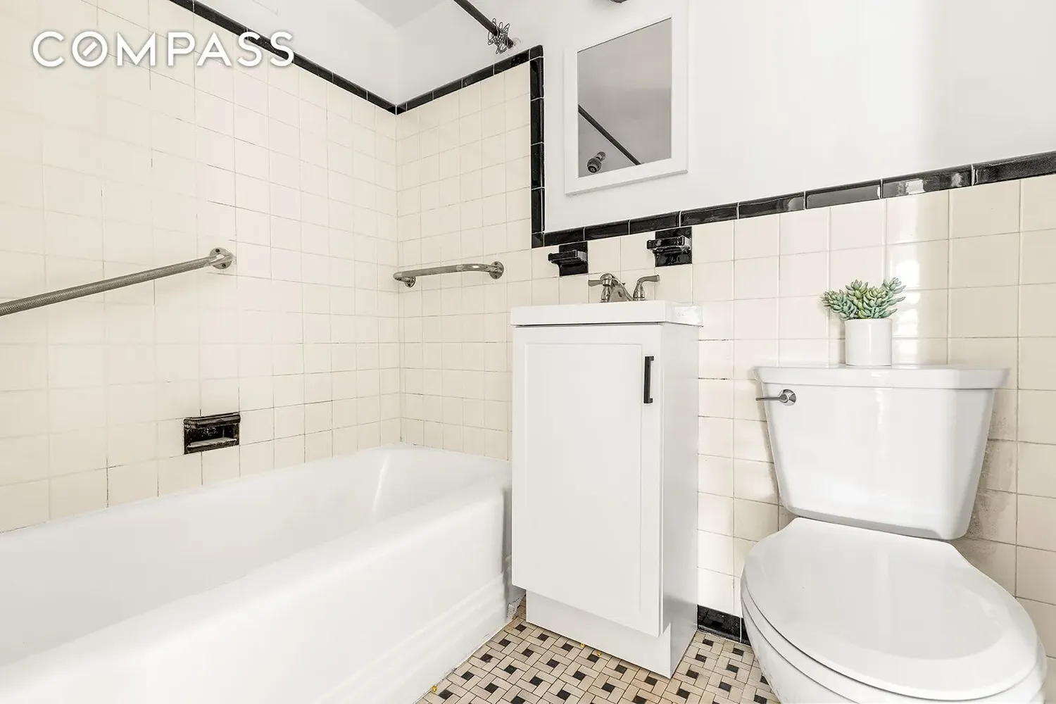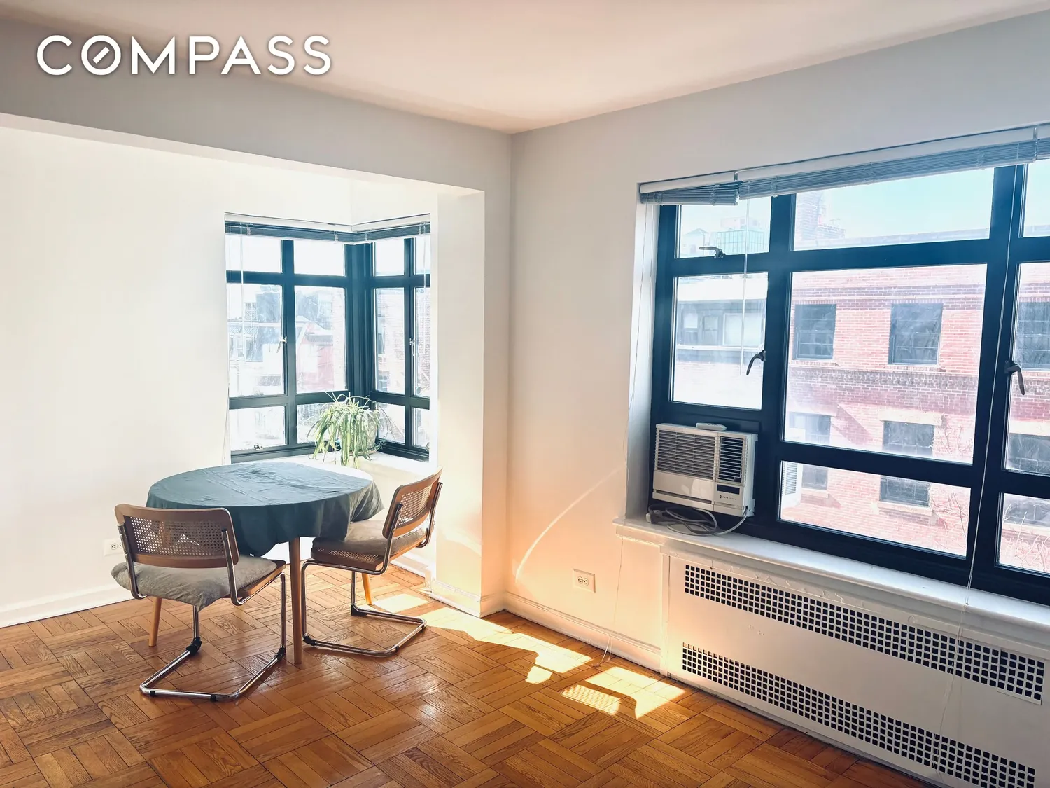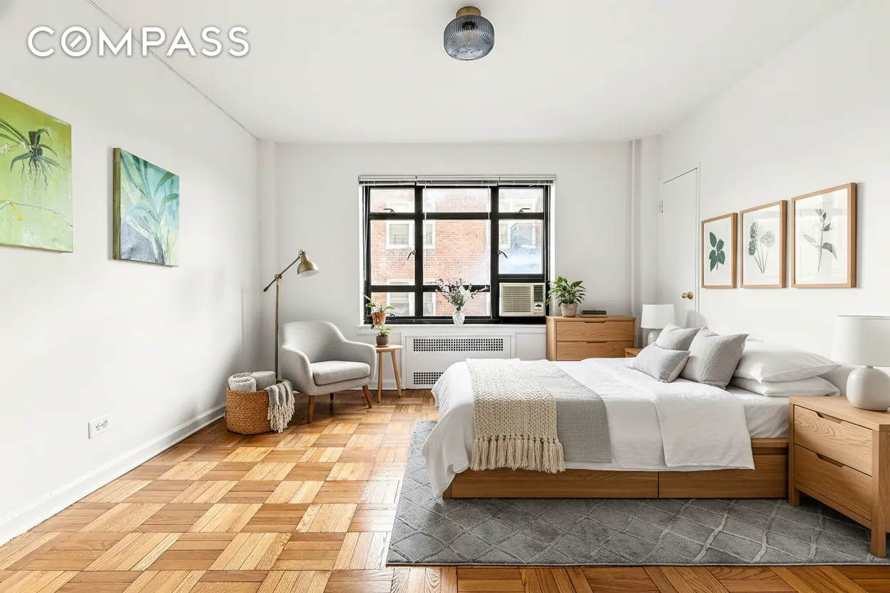 The large, light-filled living room faces southwest with street and skyline views, and room for a dining area by the corner window. The floors are the original parquet, and there is a window a/c. The separate, windowed kitchen and appliances need renovation. The bedroom has a lovely southern exposure, a window a/c and can easily accommodate a queen-sized bed. There are four closets in the unit- a walk-in coat closet, a linen closet and two closets in the bedroom.