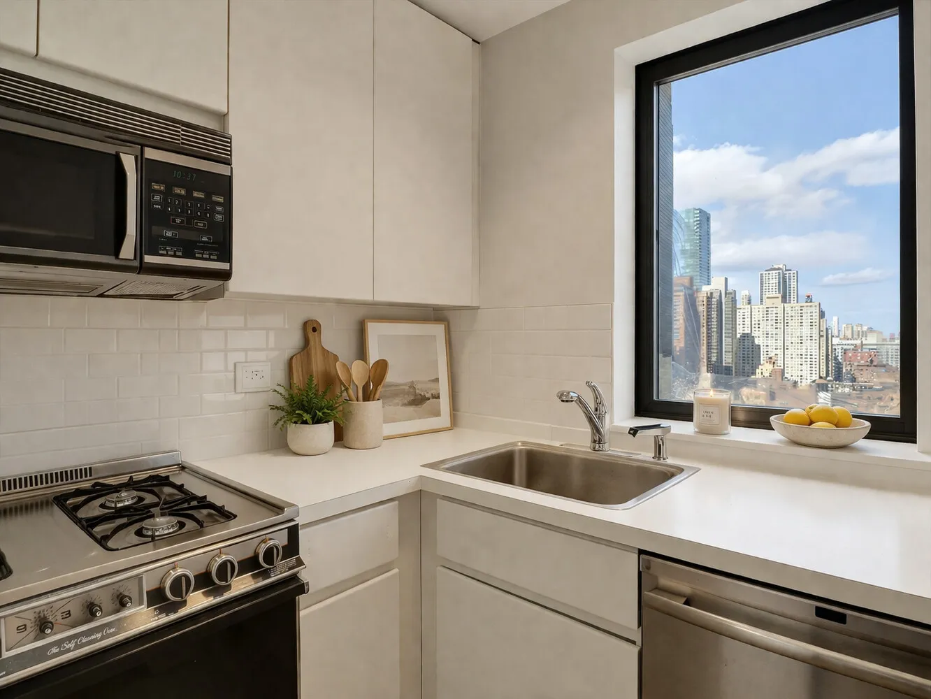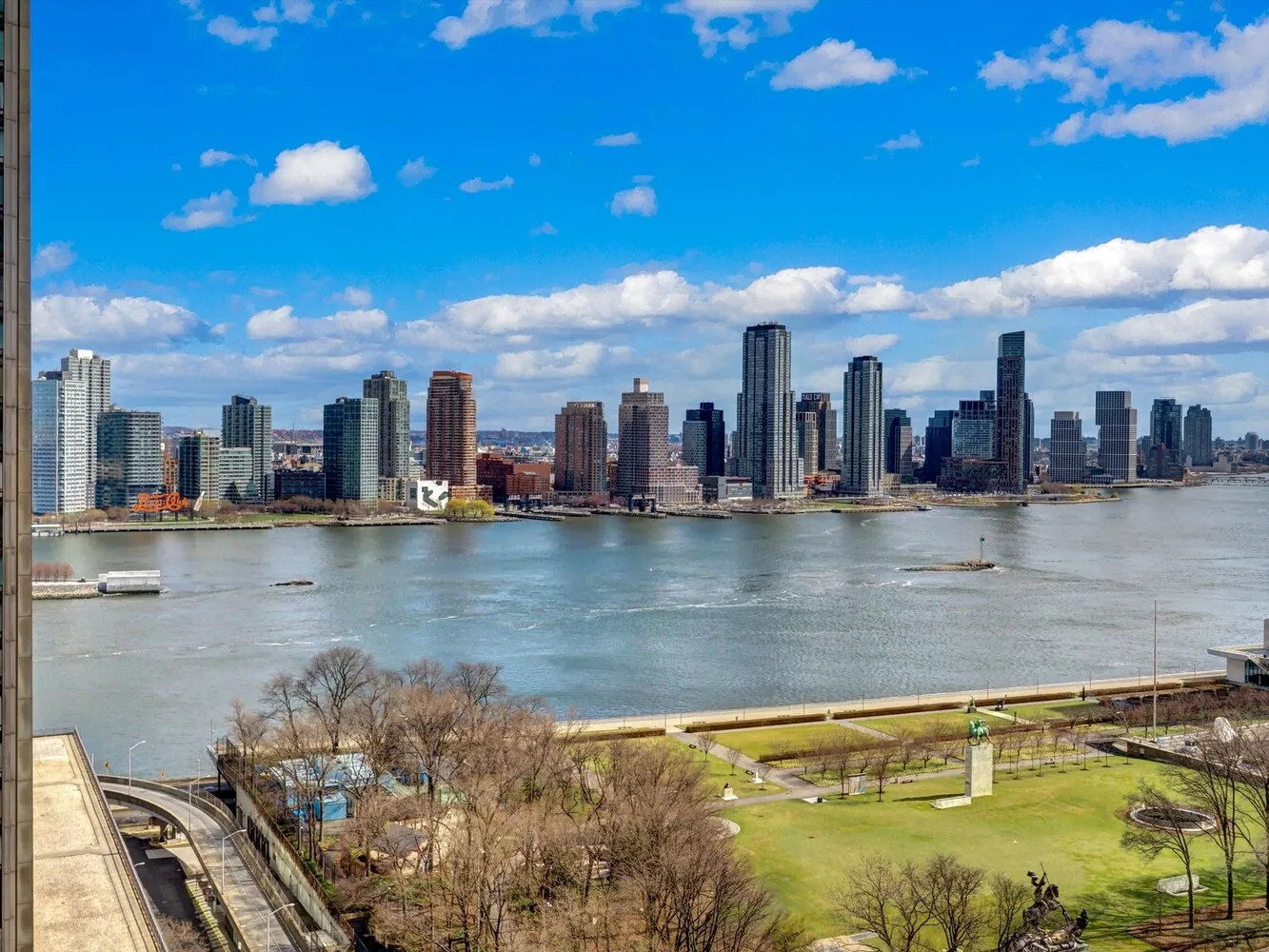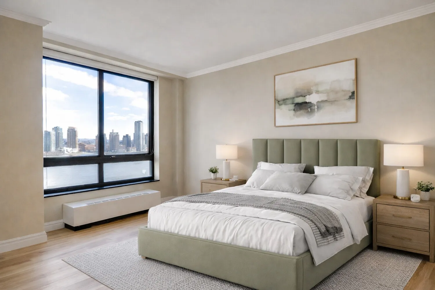 Positioned on a high floor, this coveted corner layout offers split bedrooms and expansive living space, excellent for both comfortable living and elegant entertaining. The sun-drenched living and dining area showcases panoramic skyline views to the north, along with sweeping vistas of the East River and Long Island City through floor-to-ceiling windows. The seamless access to the wraparound balcony enhances the indoor-outdoor experience, creating a perfect setting for hosting or relaxing.