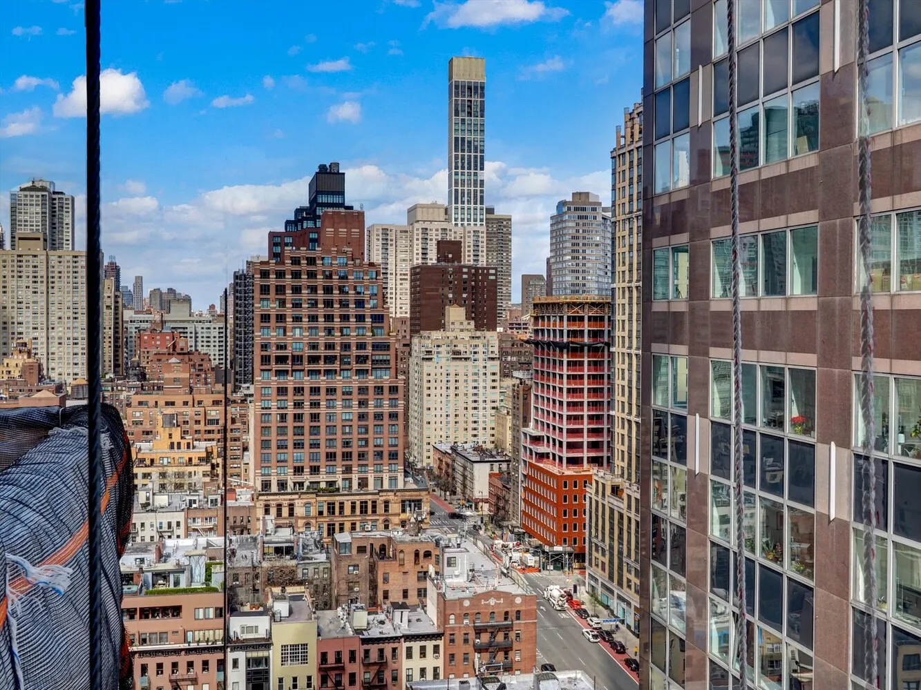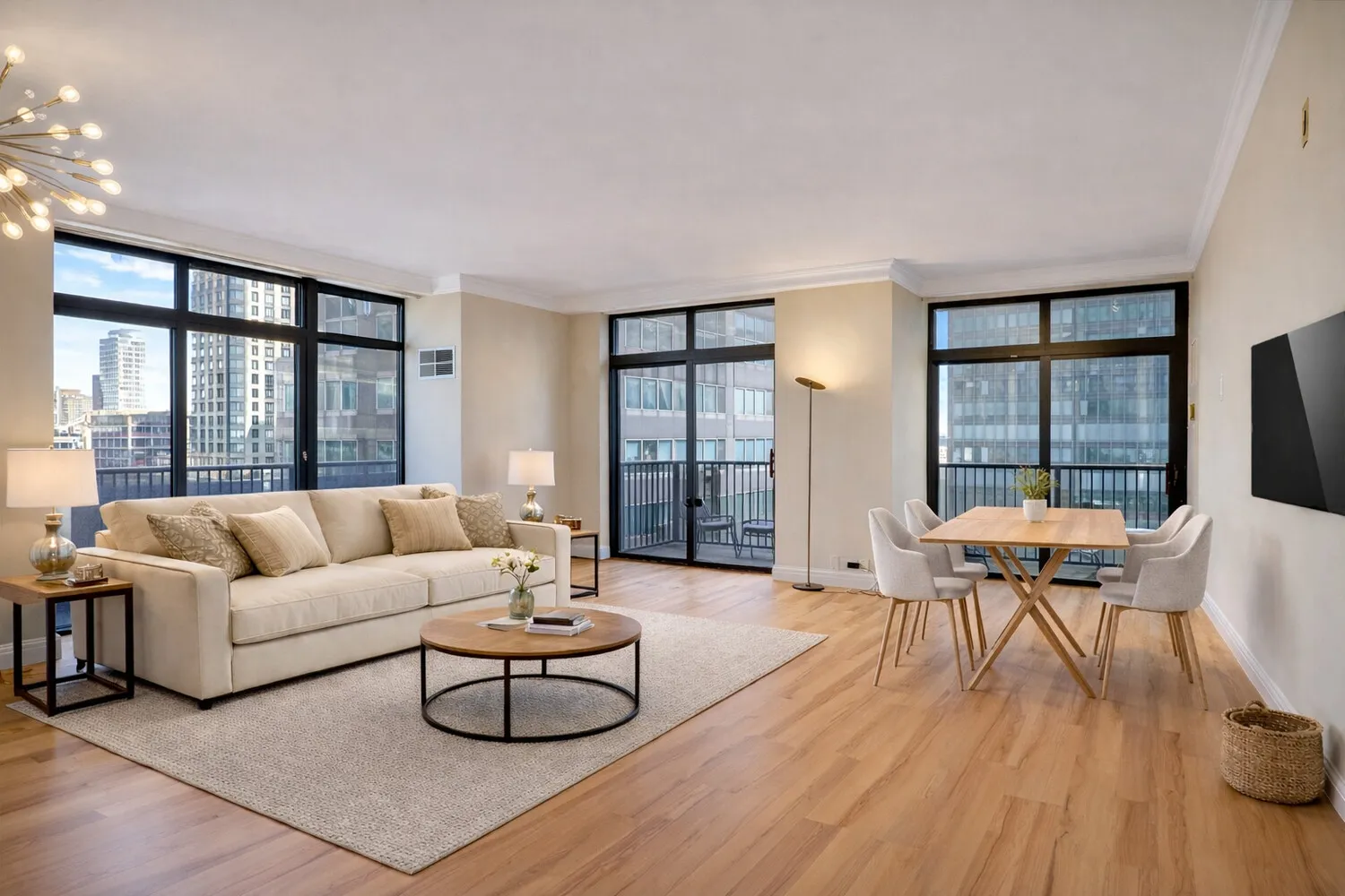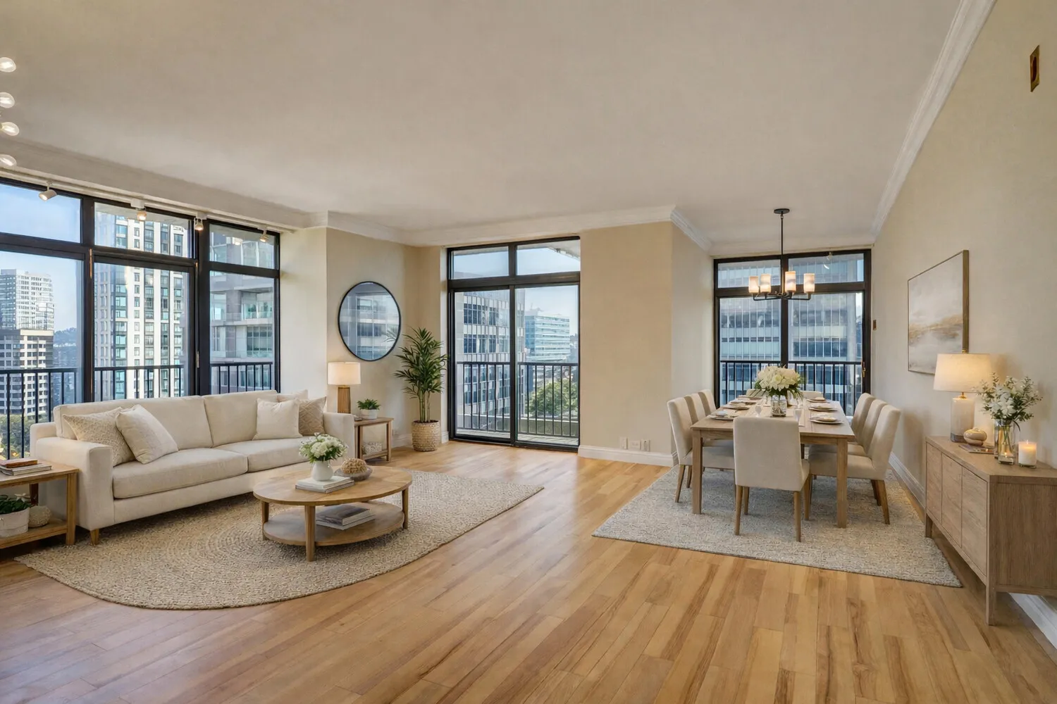 Positioned on a high floor, this coveted corner layout offers split bedrooms and expansive living space, excellent for both comfortable living and elegant entertaining. The sun-drenched living and dining area showcases panoramic skyline views to the north, along with sweeping vistas of the East River and Long Island City through floor-to-ceiling windows. The seamless access to the wraparound balcony enhances the indoor-outdoor experience, creating a perfect setting for hosting or relaxing.