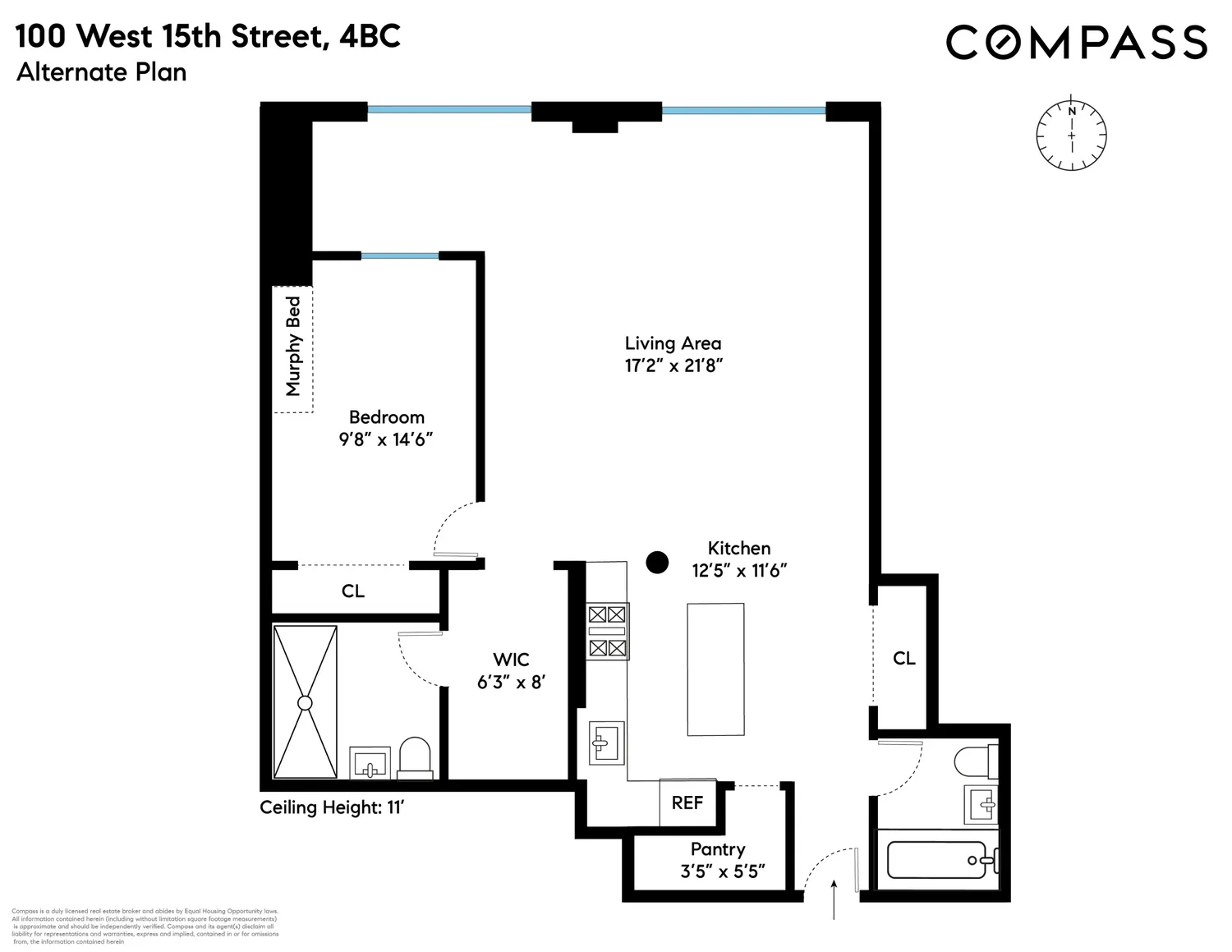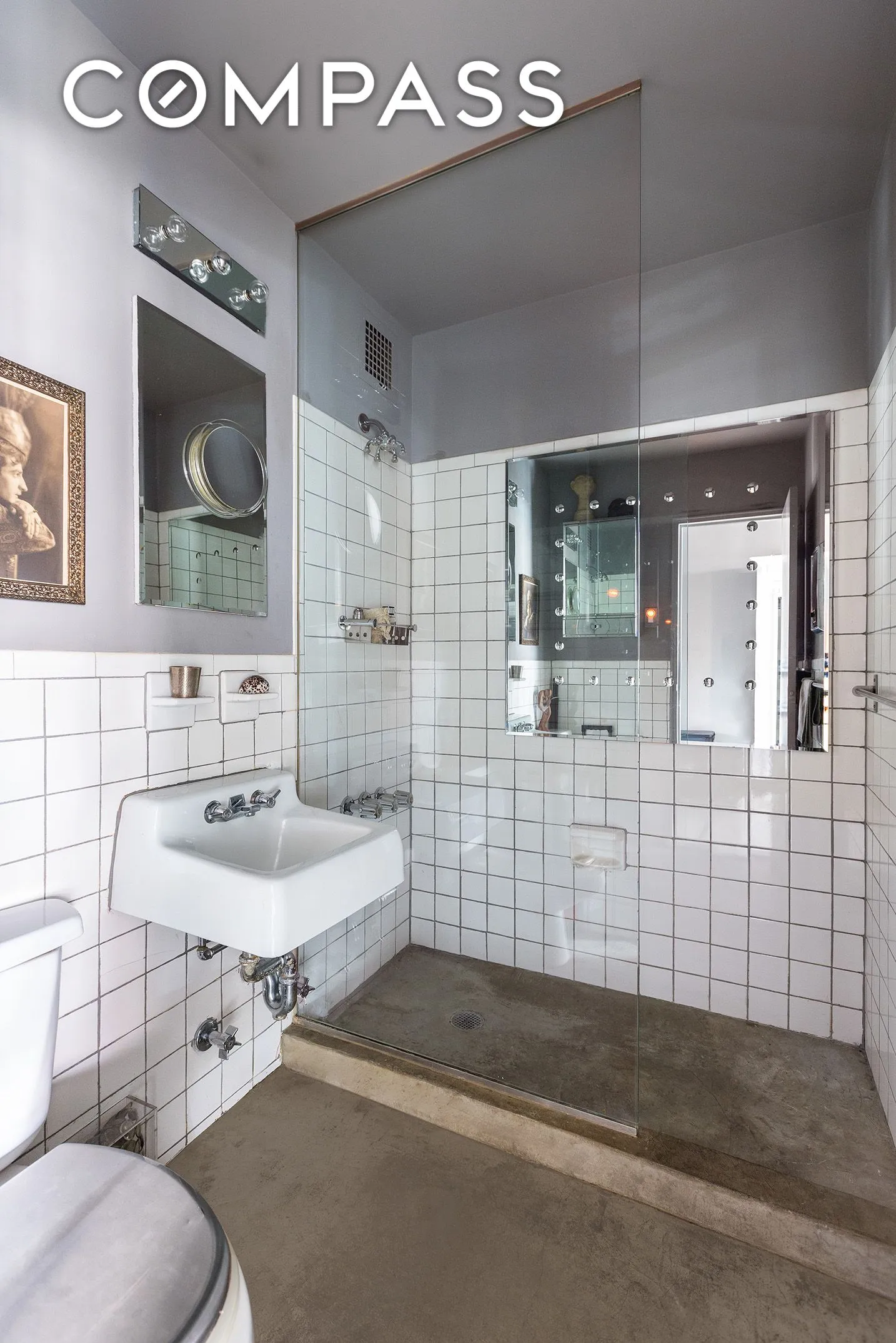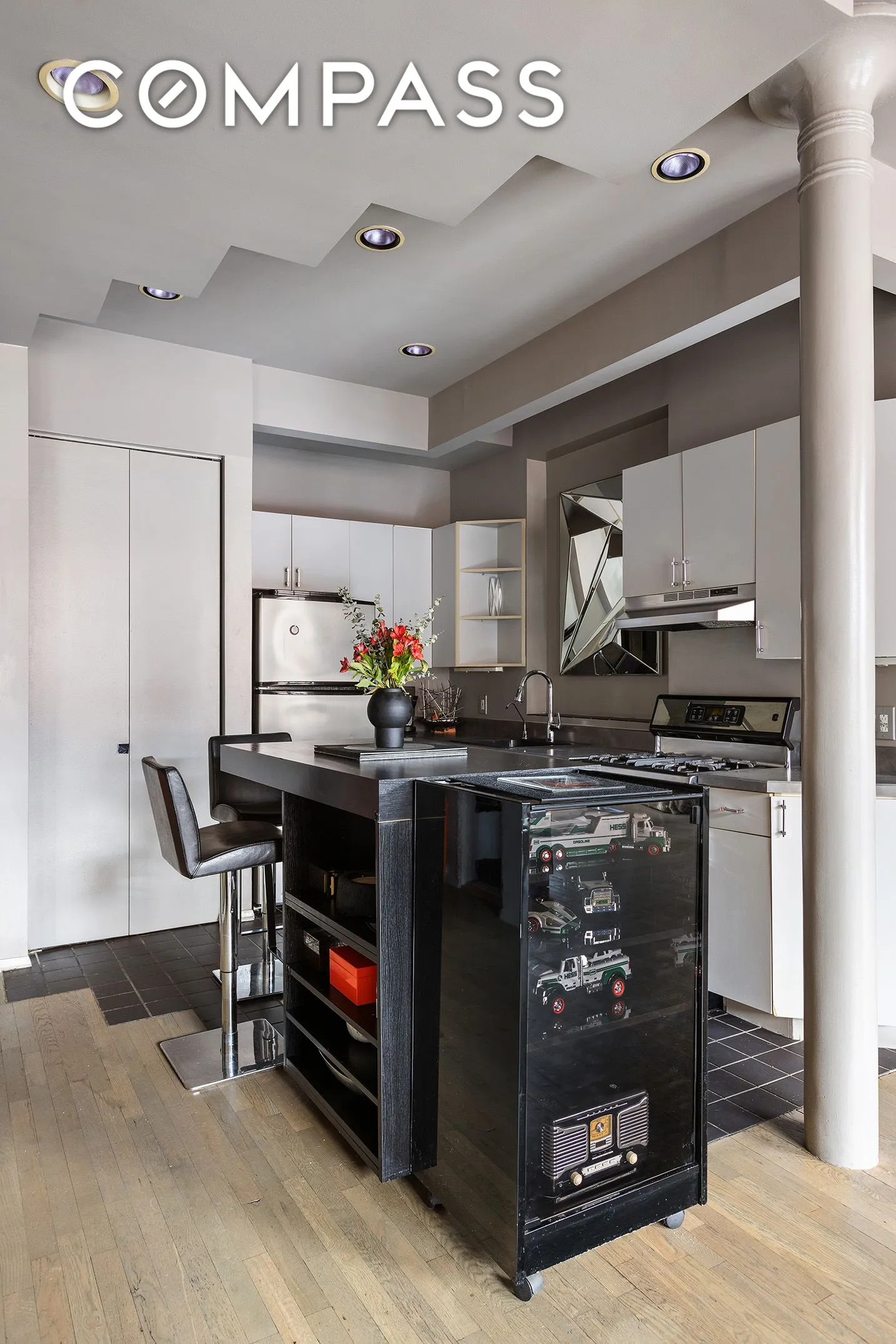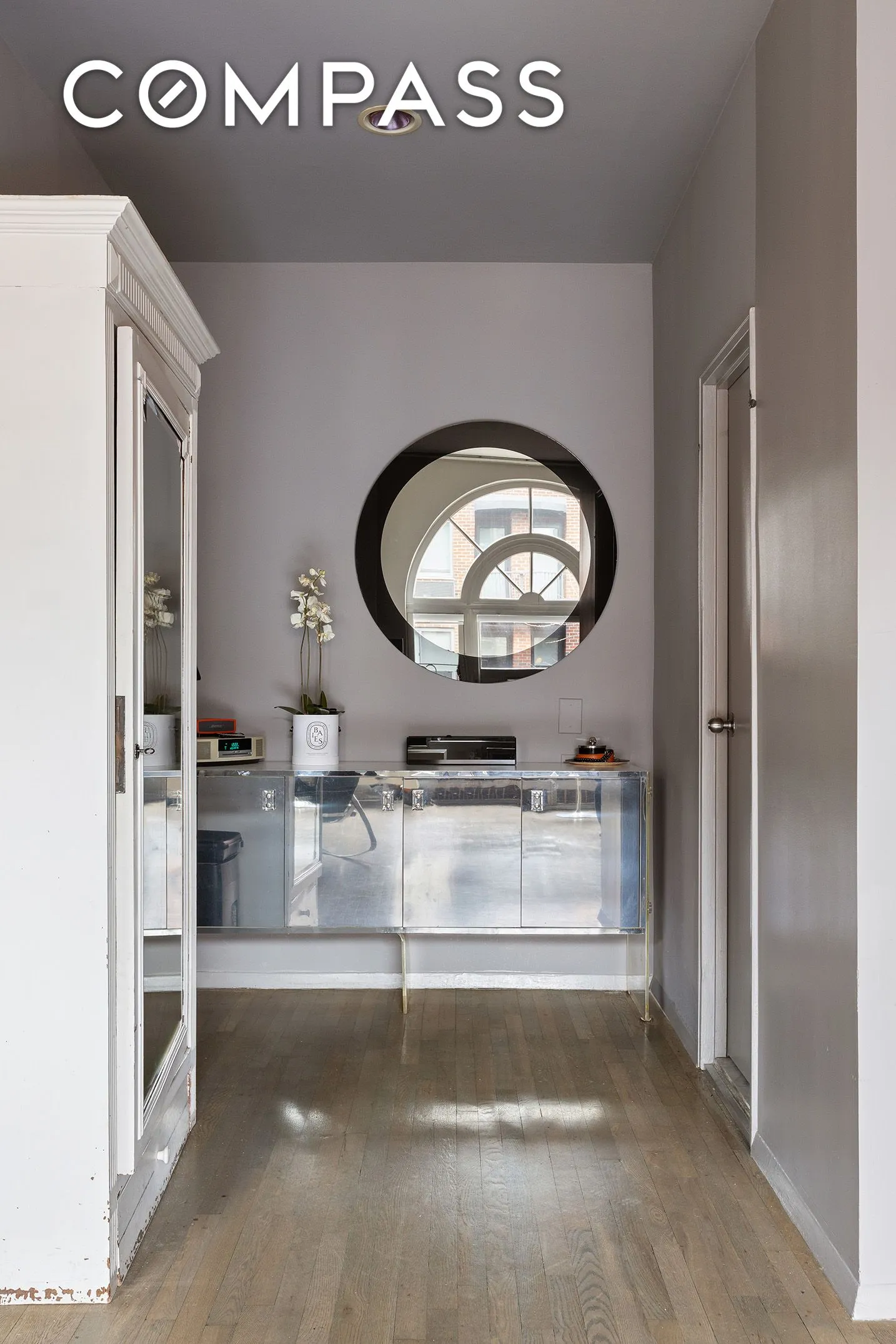 This chic and stylish, sunny Chelsea loft has 12-foot ceilings with two rare, expansive floor to ceiling arched windows, classic details like a cast iron column and exposed brick, hardwood floors, and two full bathrooms. A seamless combination of two studio apartments, this space can easily be converted to a one bedroom by just putting up a windowed wall (see Alternate Floorplan) or you can just keep the vast openness of this almost 1,000 square foot loft in its current configuration. There are also additional rooms that can be used as a pantry, dressing room, or just general storage.