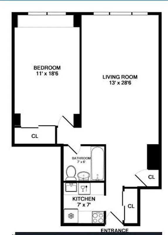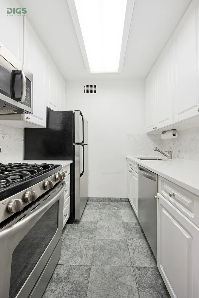 A gracious entry foyer provides ample space for artwork, a console, and even a home office nook. The expansive living and dining room features a wall of windows overlooking a tranquil, tree-lined stretch of West 13th Street-perfect for relaxing or entertaining. The renovated kitchen shines with stainless steel appliances, stone countertops, and a stylish marble-tiled backsplash. The king-sized bedroom offers a double-width closet and plenty of space for additional furniture, while refinished hardwood floors and building-supplied central air and heat complete this inviting home.