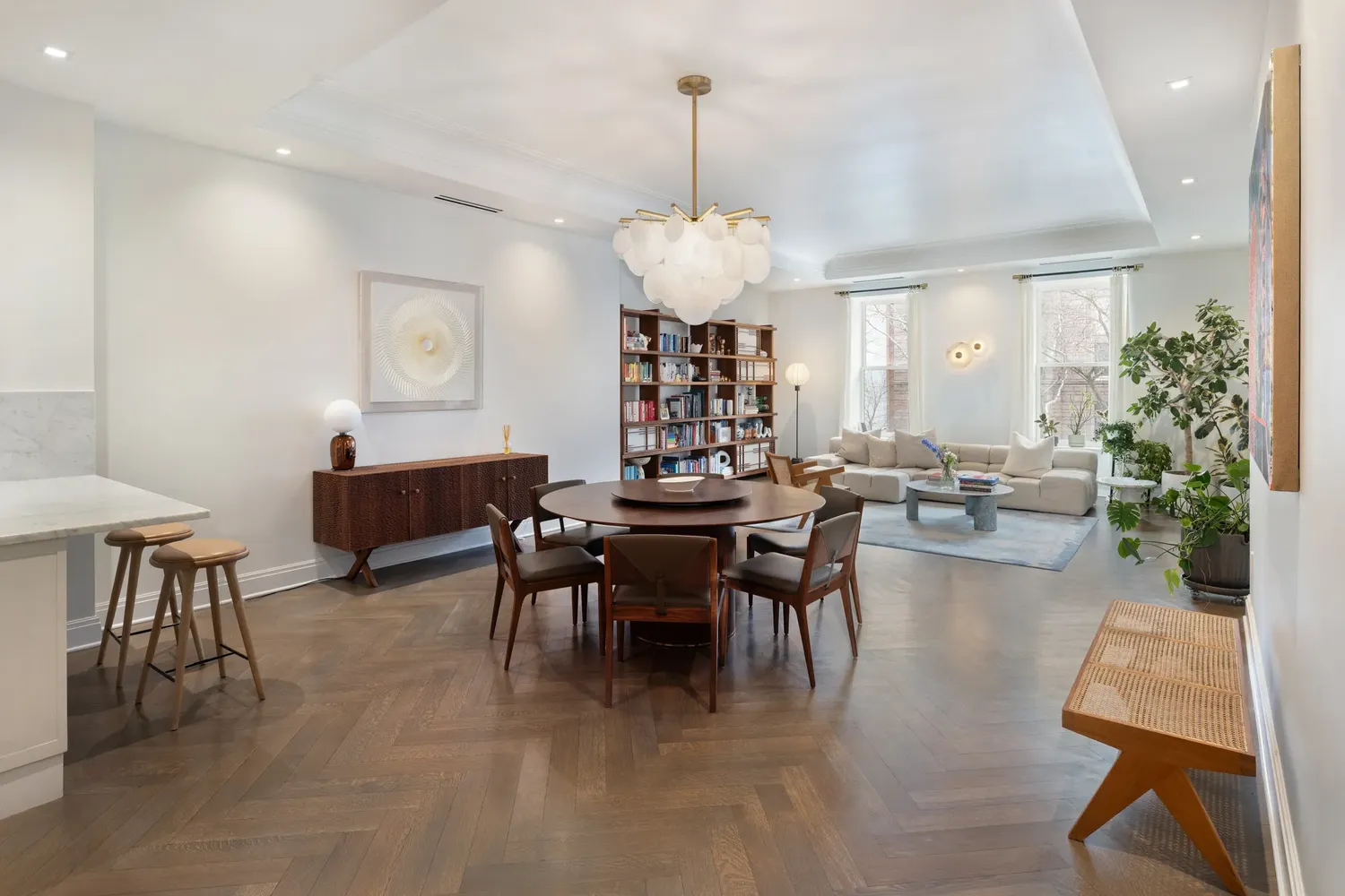 Bathed in natural light from open east and west exposures, the residence enjoys serene views over the tree-lined museum grounds, creating a tranquil and picturesque backdrop. The expansive great room offers graceful proportions for both entertaining and everyday living, framed by classic architectural detailing.
