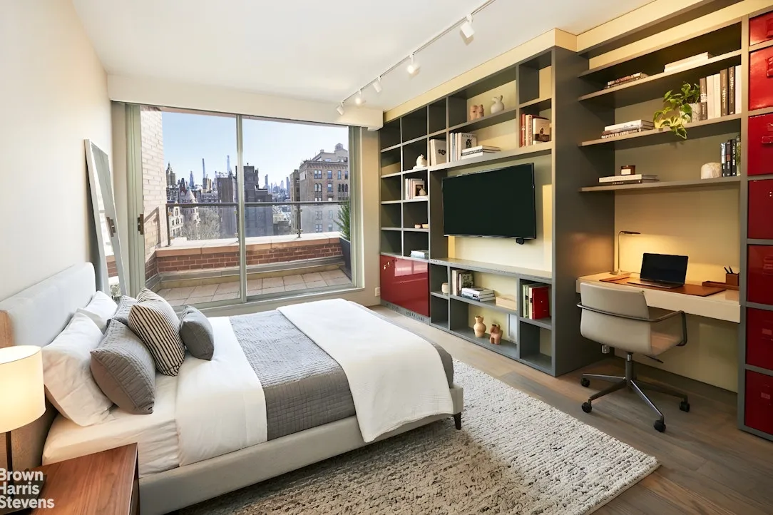 The primary suite is a study in calm and refinement, offering a custom-designed walk-in closet, a spa-quality bath with radiant heated floors and steam shower,and direct terrace access. The secondary bedroom, equally generous, is thoughtfully appointed with a built-in workspace-balancing comfort with