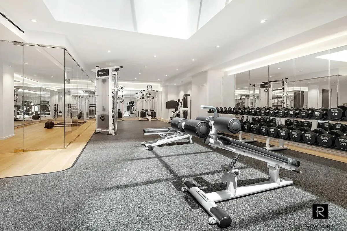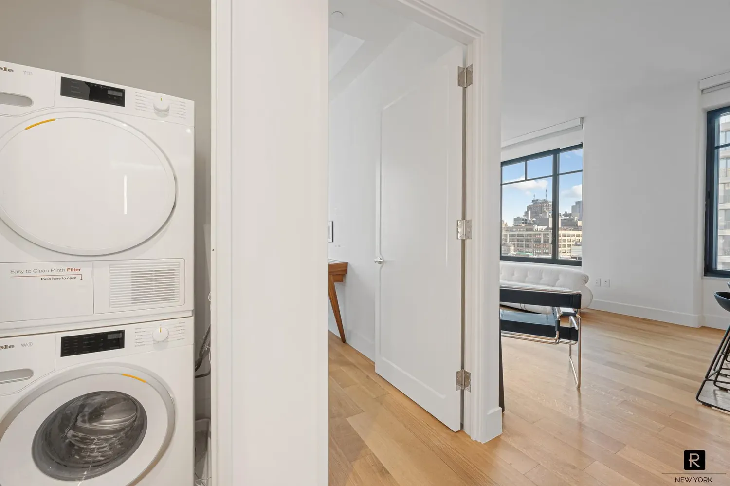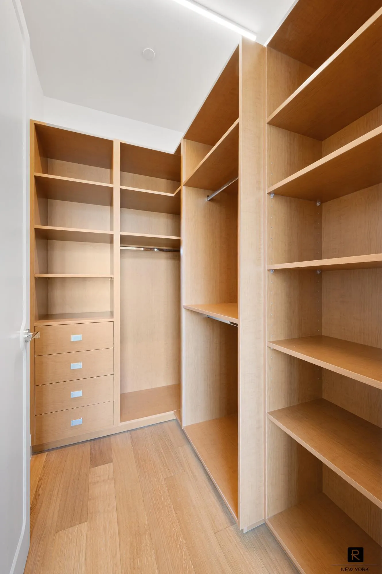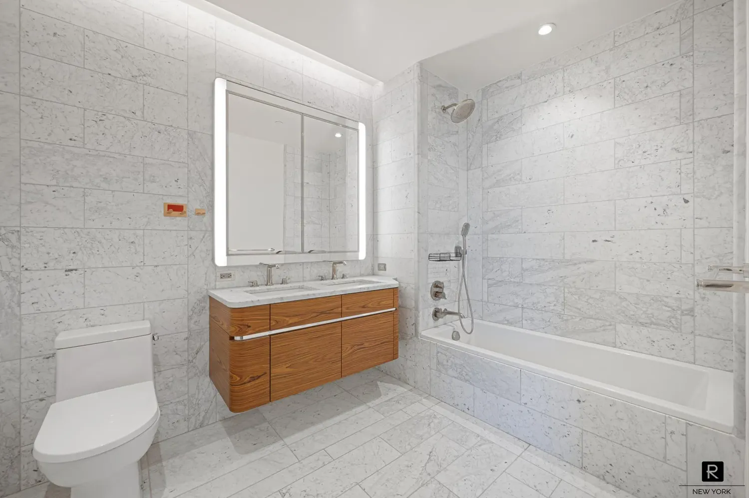 Expansive casement windows flood the space with natural light, accentuating the wide-plank European white oak floors. The gourmet kitchen showcases Miele appliances, custom walnut cabinetry, and fluted mirror casework by Molteni&C, while the uniquely designed island and countertops are clad in honed Carrara marble. The spa-like bathroom is finished in marble, engineered-rosewood wall-hung vanities, and polished nickel hardware, creating a serene retreat.