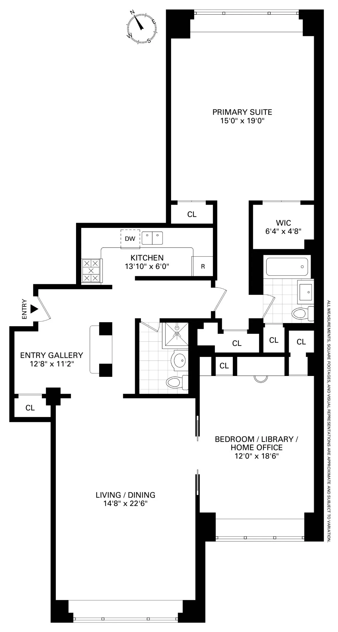 The private primary suite with walk-in closet enjoys an ensuite bath. It is a retreat unto itself - 15" x 19" with a large street-facing window for light and connection to the city. A walk-in closet offers abundant storage, while the ensuite bath features a combination bathtub and shower.