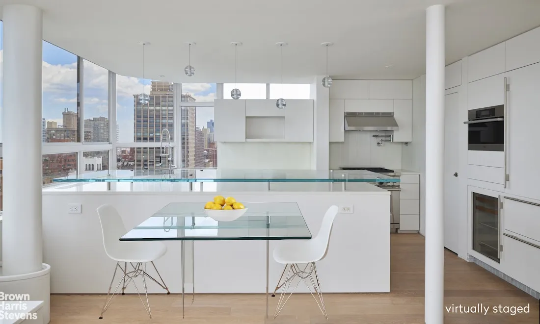 Enter directly off the keyed elevator to arrive at this private floor through residence. Wrap-around windows face north, east and west. Updated and expanded, the Kitchen features high end appliances: Miele Dishwasher and Wall Oven, Wolfe Stove, Sub Zero Refrigerator & Wine Cooler as well as additional refrigerator drawers under the glass topped peninsula counter - a perfect seating area with bonus of cleverly designed storage. A pot filler above the stove, oversized sinks and a designated area at window for herbs and plants are also noteworthy. Adjacent to the kitchen is the Laundry Area with a full sized Miele washer/dryer and access to the service elevator.