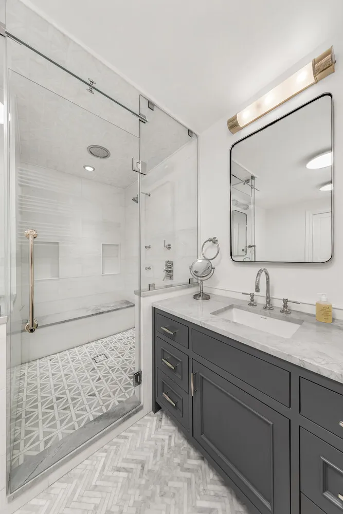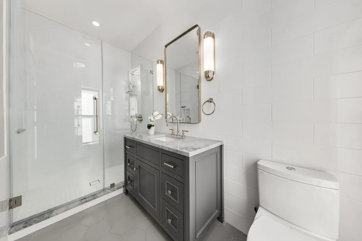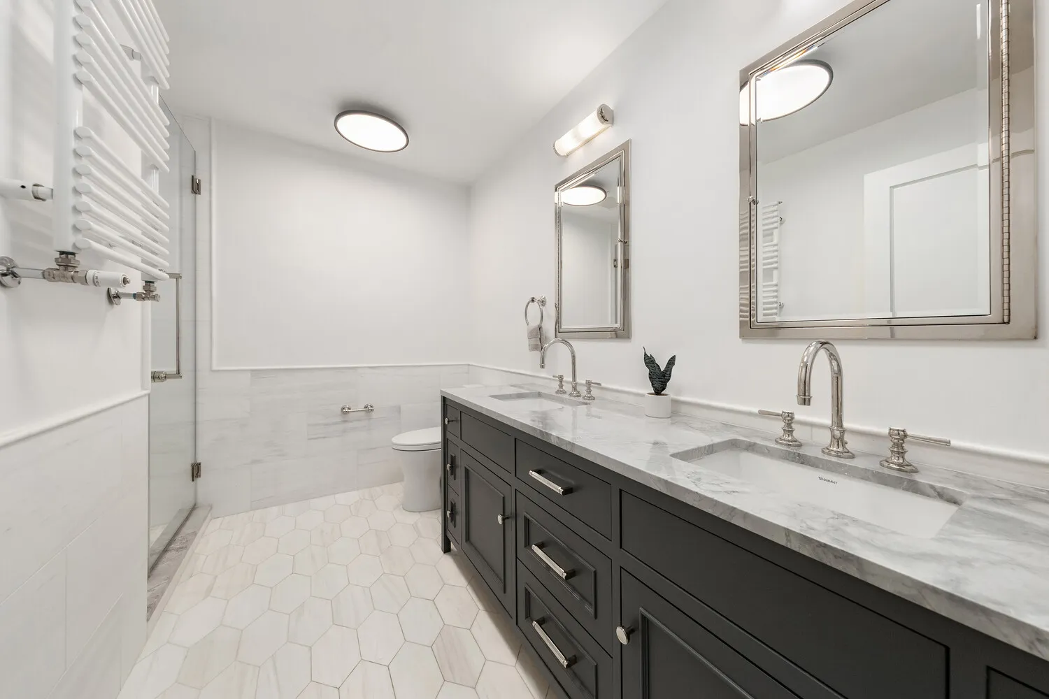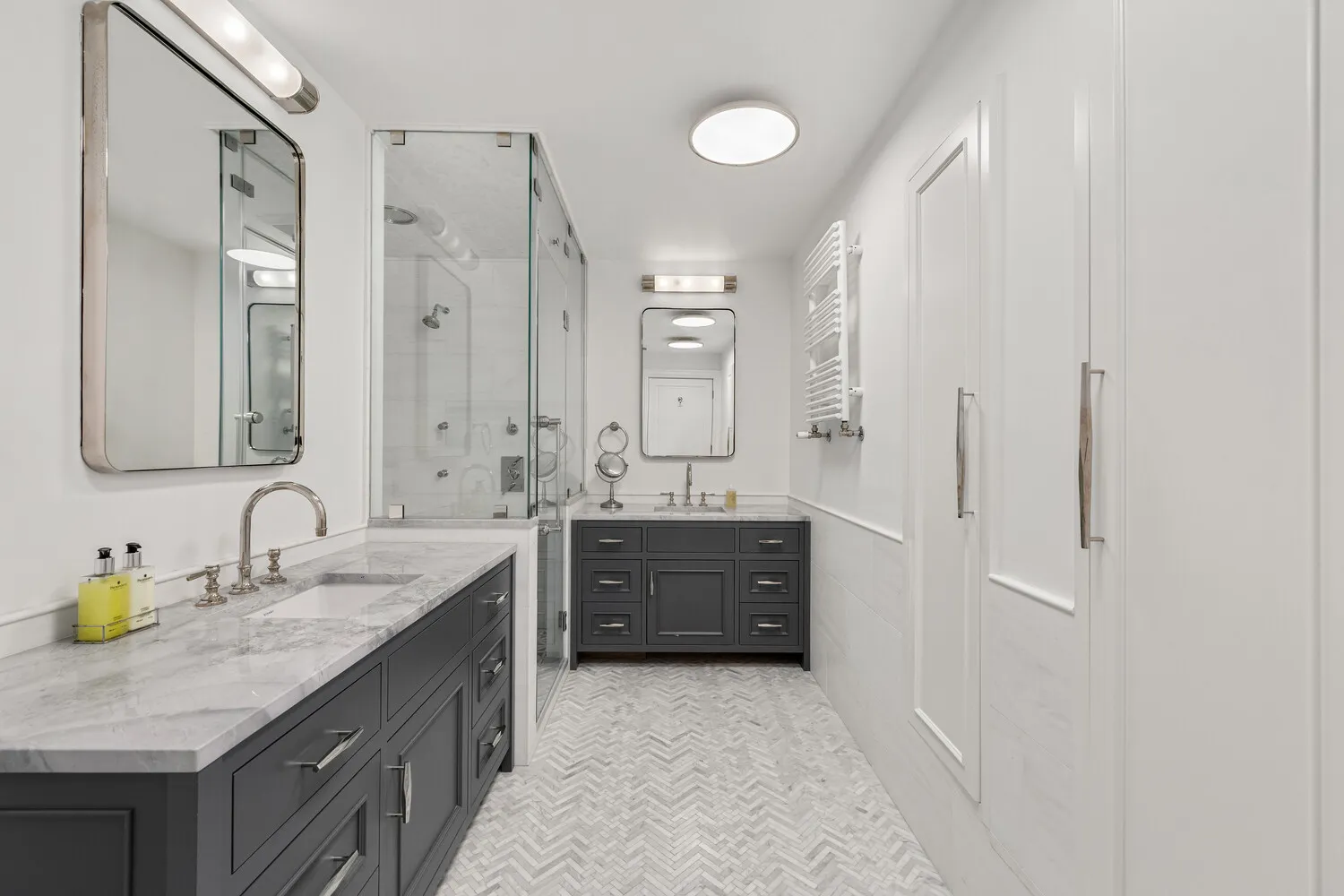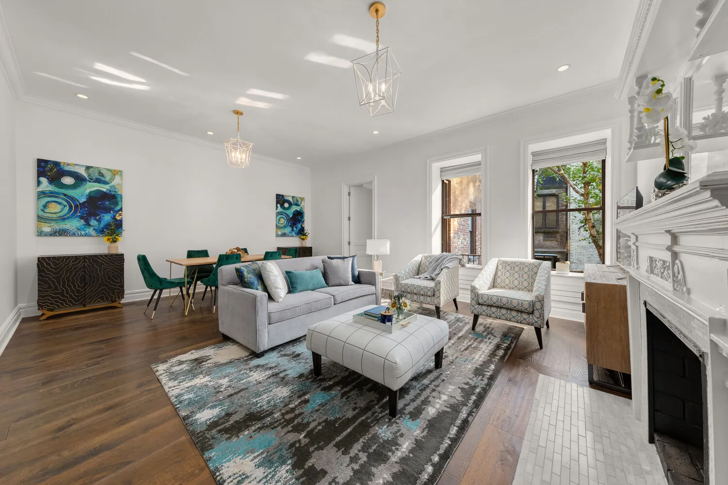 The stunningly renovated owners' unit (duplex + partially finished cellar) greets you with a bespoke chef's kitchen with custom painted wood cabinetry, Wolf professional 6 burner range with griddle, panel front Subzero refrigerator and marble countertops. The kitchen flows into the great room featuring masterfully restored original trim & moldings and fireplace, weaving together the best of modern comfort with the grandeur of 19th century townhome life. The irregular sized lot (22' at front, 25' at back of lot) allows for a 20'+ interior dimension of the great room, giving design freedom from the standard townhome layout. There is a door on the parlor level leading down to the slate paved & landscaped backyard. Additionally on the parlor level are two king sized bedrooms, one with en suite bath and the other a hallway bathroom. The lower level features two bedrooms with en suite bathrooms in addition to the primary suite with custom steam shower, separate marble topped vanities, custom fitted walk in closet and access to the rear yard. Zoned central air conditioning throughout.