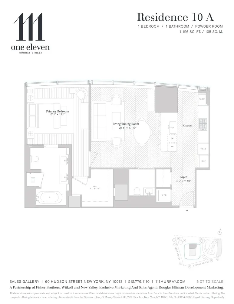 A world-class condominium tower located in Tribeca and developed by a partnership of Fisher Brothers, Witkoff, and New Valley, 111 Murray Street soars some 800 feet, offering 157 residences ranging from one-bedrooms to full-floor penthouses. 111 Murray Street is a collaboration between some of the best and brightest minds in architecture and design, with architecture by Kohn Pedersen Fox, residence interiors by David Mann, amenities and public spaces by David Rockwell, and landscape architecture by Edmund Hollander. Over 20,000 square feet of private indoor and outdoor spaces include two levels of state-of-the-art amenities including 2 pools and 3,000 sf fitness center, saunas and treatment rooms as well as stunning landscaped gardens, seamlessly integrating the interiors and the outdoors.