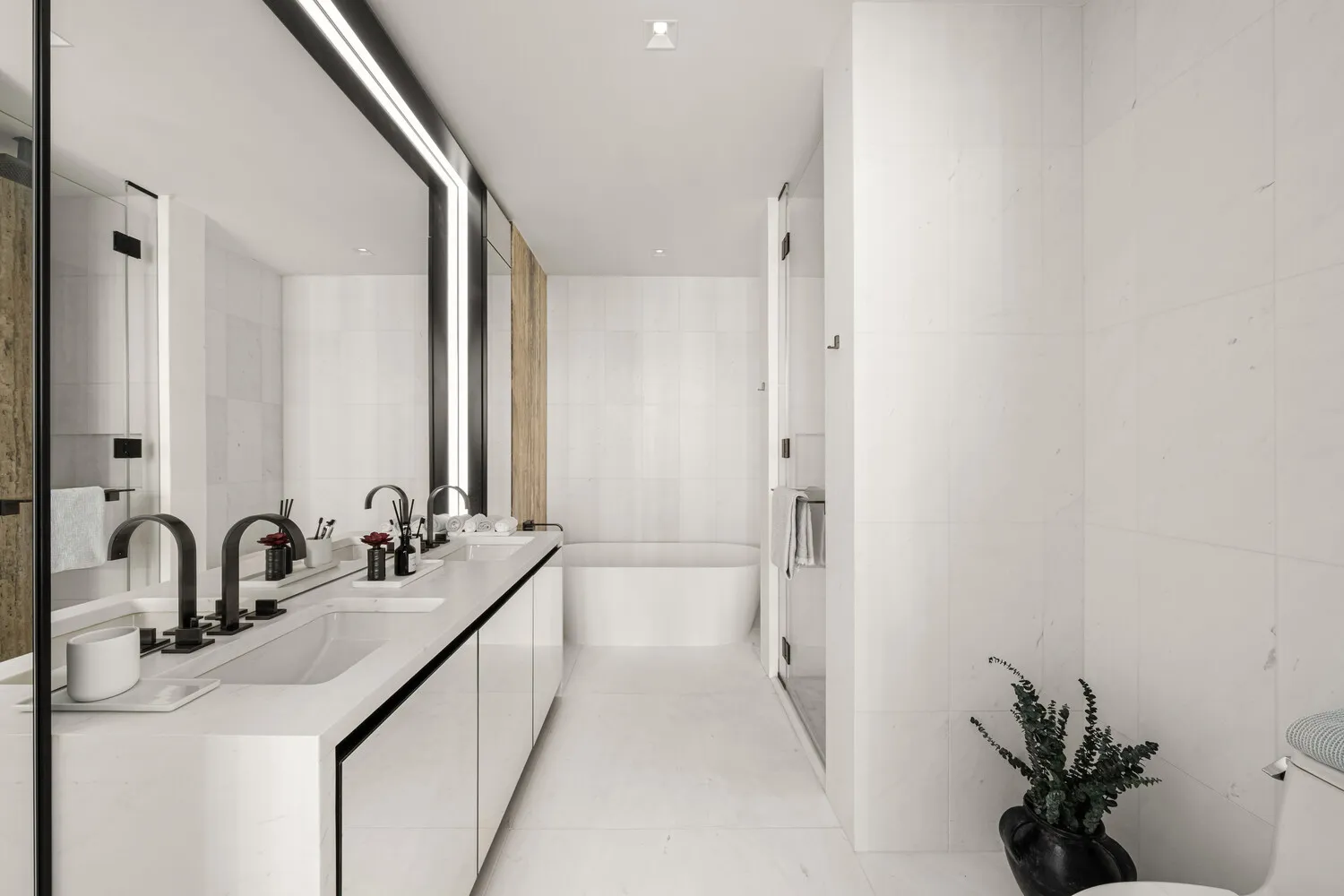 Retreat to the primary bedroom suite, a sanctuary distinguished by a spacious walk-in closet and a spa-inspired primary bathroom. Here, a freestanding BluStone soaking tub and separate glass-enclosed shower with travertine stone slab walls set the stage for relaxation. Dual white marble slab vanities are complemented by Dornbracht fittings in a soft black matte finish. Completing this luxurious space, full-length mirrored storage cabinets are seamlessly integrated adjacent to each vanity for bath and beauty essentials.