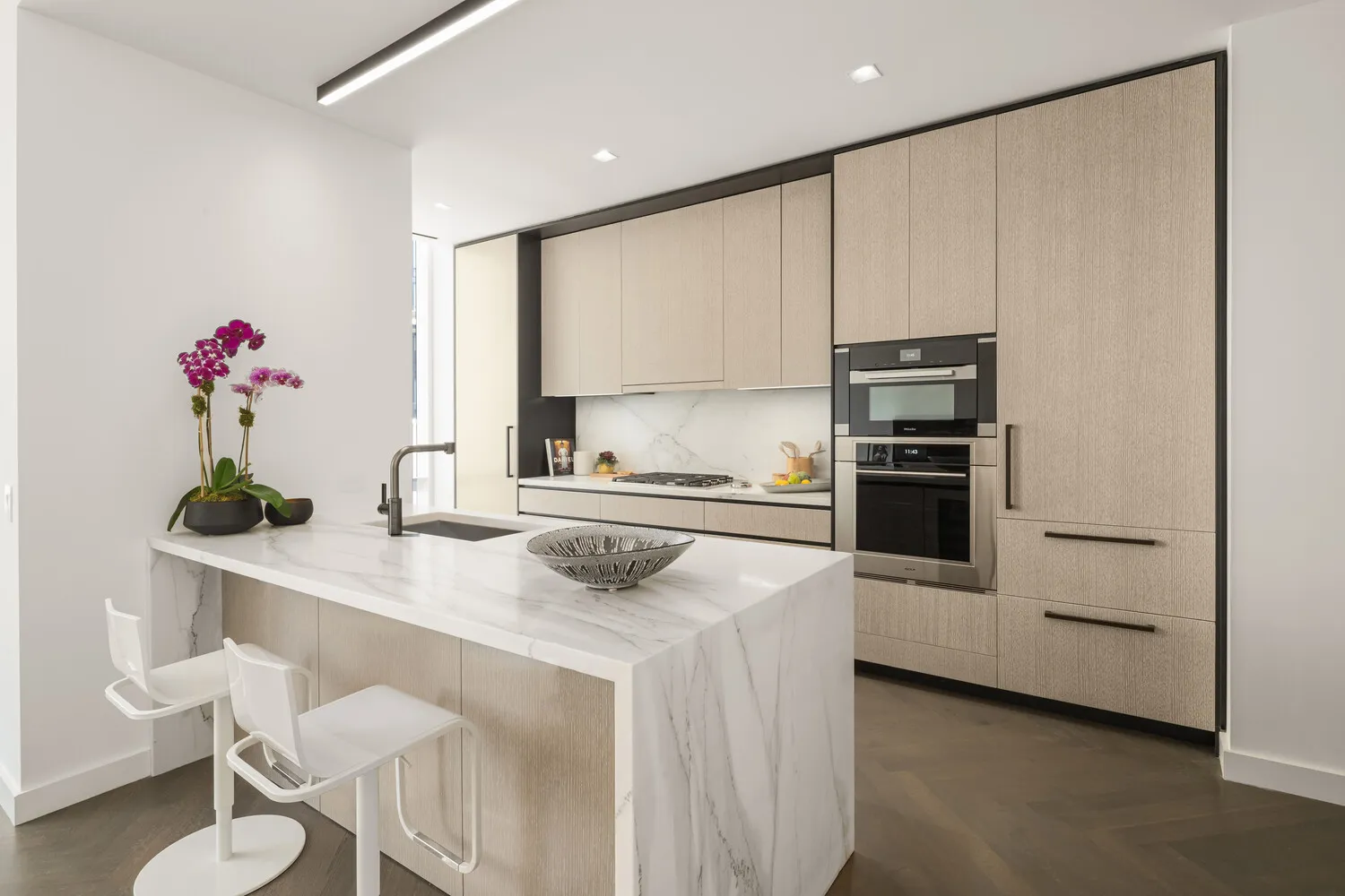 A formal entry foyer leads to a generously sized 22'5" x 17'10" living and dining area with an open kitchen is ideally suited for both entertaining and daily living. Designed by AD100 designer David Mann, the custom Molteni kitchen boasts cerused White Oak cabinetry with bespoke soft black metal accents. The Calacatta Borghini marble island showcases book-matched waterfall edges complemented by matching countertops and backsplash. Dornbracht fixtures in a custom soft black matte finish add another sophisticated touch. Premium appliances from Wolf, Miele, and Sub-Zero-including a 30" refrigerator/freezer, four-burner gas cooktop with built-in canopy hood, integrated dishwasher, wall oven, speed oven, and wine refrigerator-fulfill every culinary requirement. The kitchen's functional layout, including a pantry and elegant breakfast bar, offers an inviting setting for formal entertaining or tranquil mornings alike.