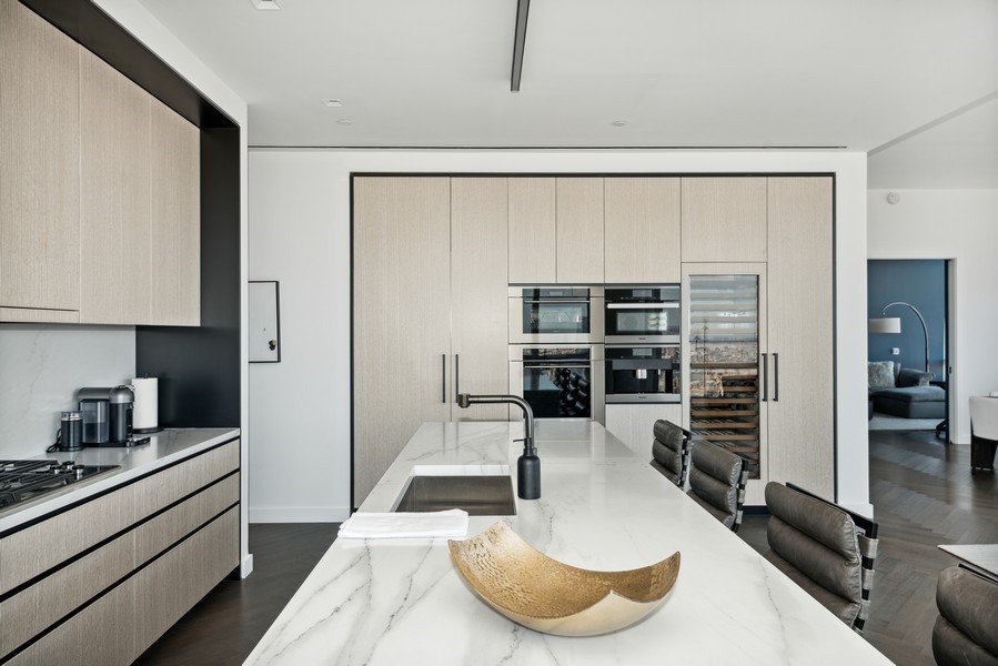 The adjacent eat-in kitchen with an entire wall of floor-to-ceiling windows, center island breakfast bar, and dual points of entry, allows for seamless entertaining and intimate daily living alike. Meticulously designed by AD100 designer David Mann, the custom Molteni kitchen offers cerused White Oak cabinetry trimmed in custom soft black metal, a Calacutta Borghini marble island with book-matched waterfall, countertop, and backsplash, Dornbracht fixtures in a custom soft black matte finish, four pantries, and top-of-the-line appliances by Wolf, Miele, and Sub-Zero including a 30-in. refrigerator, 18-in. freezer, 36-in. 5-burner gas cooktop with built-in fully vented hood, integrated dishwasher, wall oven with warming drawer, steam oven, speed oven, full-height wine refrigerator, and integrated coffee system.