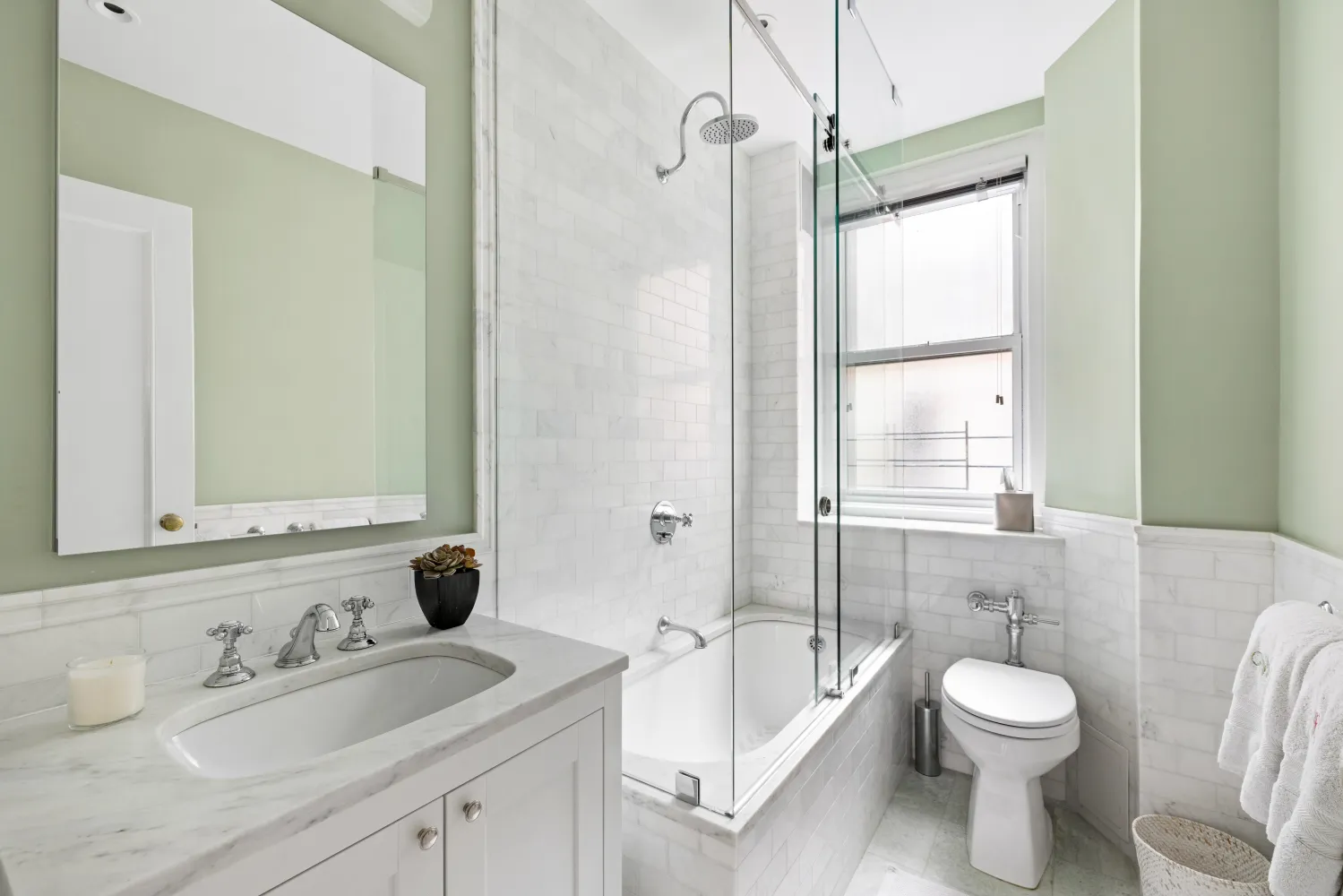 closets and share the second windowed marble bathroom. A storage bin
