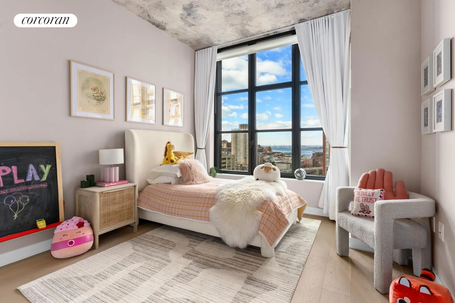 Oversized industrial casement windows wrap the great room, framing sweeping views of the New York Harbor, Statue of Liberty, Manhattan skyline, and both the Manhattan and Williamsburg Bridges. Ten-foot ceilings and all-day natural light create a dramatic yet serene living experience.
