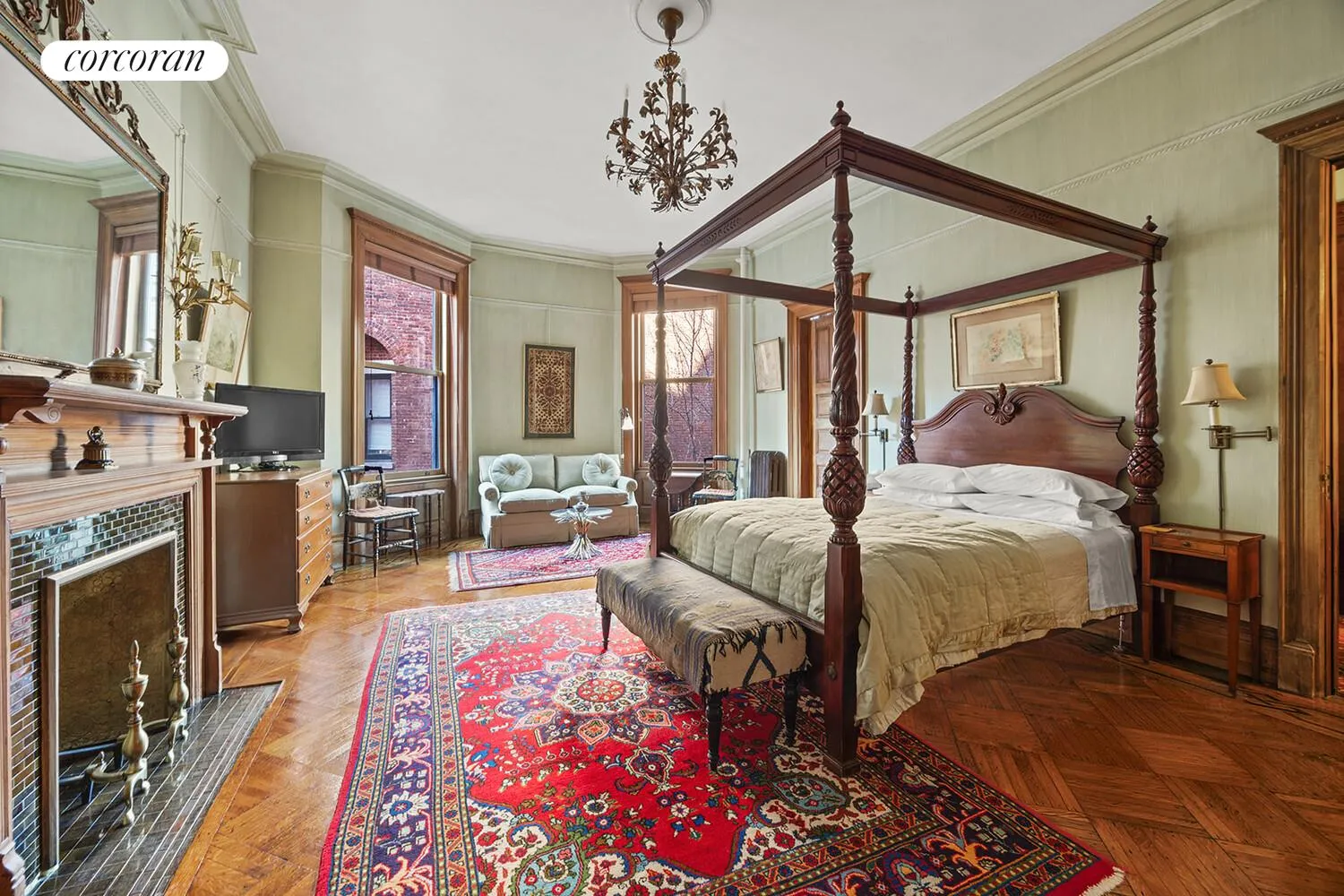 The parlor floor is distinguished by scale and craftsmanship, with expansive entertaining rooms, coffered tiger oak ceilings, restored millwork, and a renovated butler's pantry that supports modern entertaining while preserving historic function. Upper floors provide a thoughtful balance of private bedrooms, flexible living arrangements, and, at the top of the house, a self-contained level with its own kitchen-ideal for extended family, guests, or long-term stays.