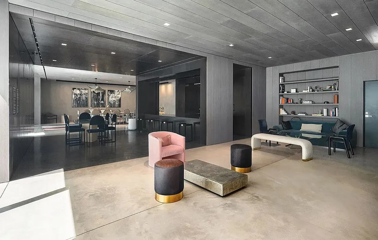 The thoughtfully designed layout includes a spacious living area that seamlessly offers flexible functionality. A chef's dream kitchen is outfitted with a premier Gaggenau appliance package, including a cooktop, oven, paneled refrigerator, and dishwasher. Sophisticated finishes include acid-etched, back-painted glass backsplash and sleek black polished quartz countertops with beveled edging.