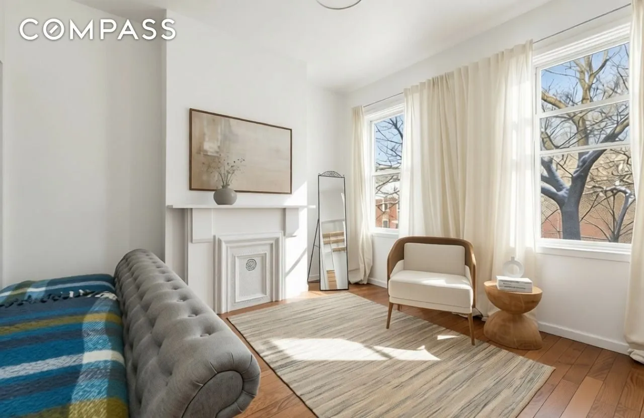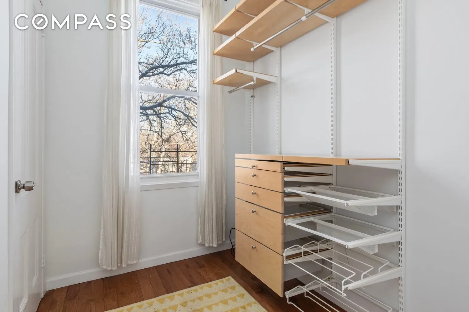 The oversized primary bedroom offers an alcove layout that also has space for a proper bedroom set. The second room—currently used as a walk-in closet—can easily be reconfigured as a nursery or home office. The apartment is move-in ready and so appealing that it could just as easily serve as the owner’s residence.