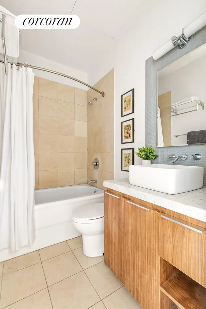 The lower level of the duplex is dedicated to serene private quarters. The primary suite features an oversized spa-like bathroom with radiant heat flooring, a bidet toilet, a freestanding glass-enclosed shower, and a deep soaking tub. A full wall of closets offers exceptional storage, and the bath opens directly into a king-sized bedroom with a dedicated home office, overlooking the fully hardscape garden. Two additional bedrooms on this level share a beautifully renovated travertine bathroom with a soaking tub.