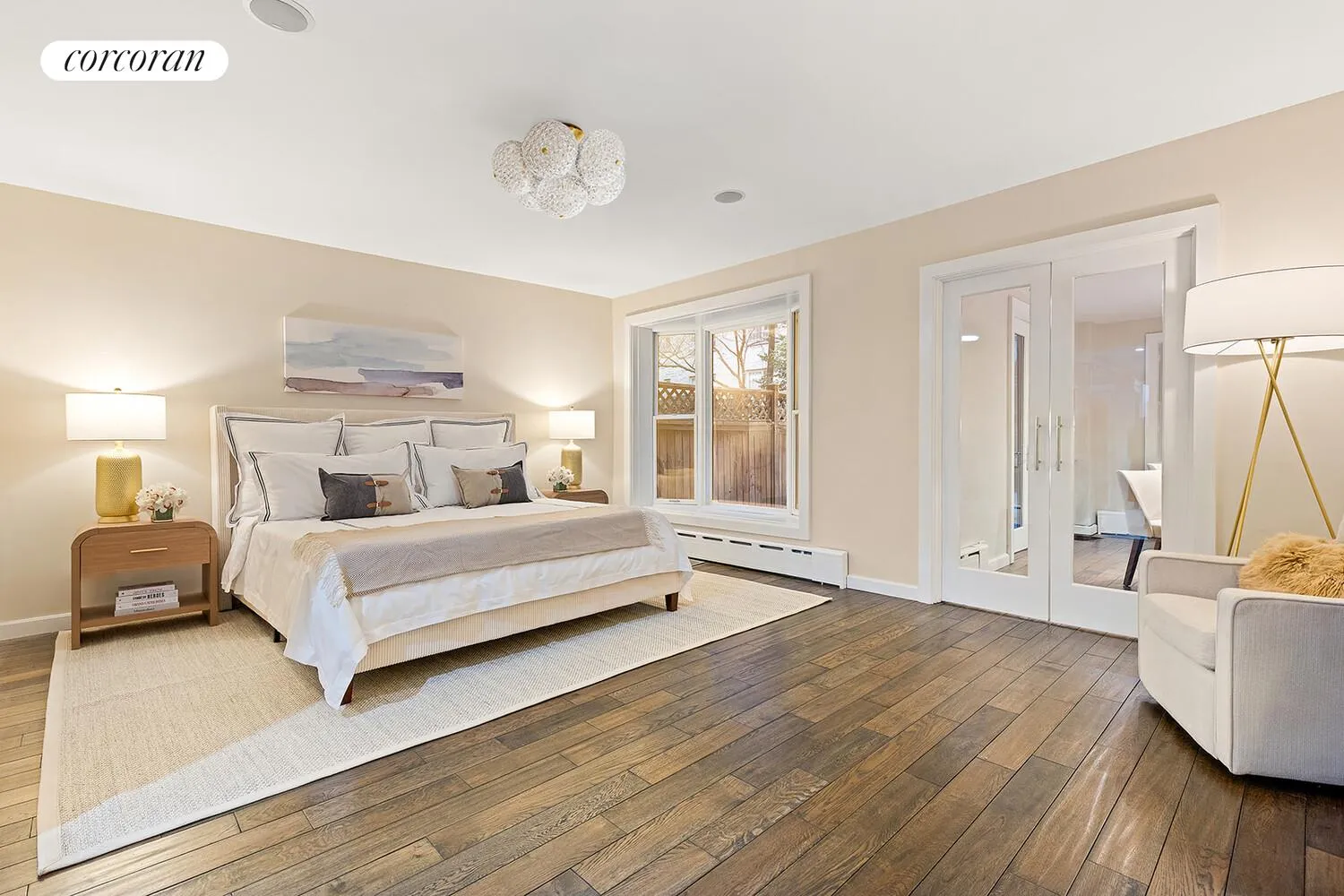 The second-floor apartment is a sun-filled three-bedroom, one-bathroom home that feels like a chic French-style escape. Two elegant French doors open onto a charming balcony overlooking the backyard.