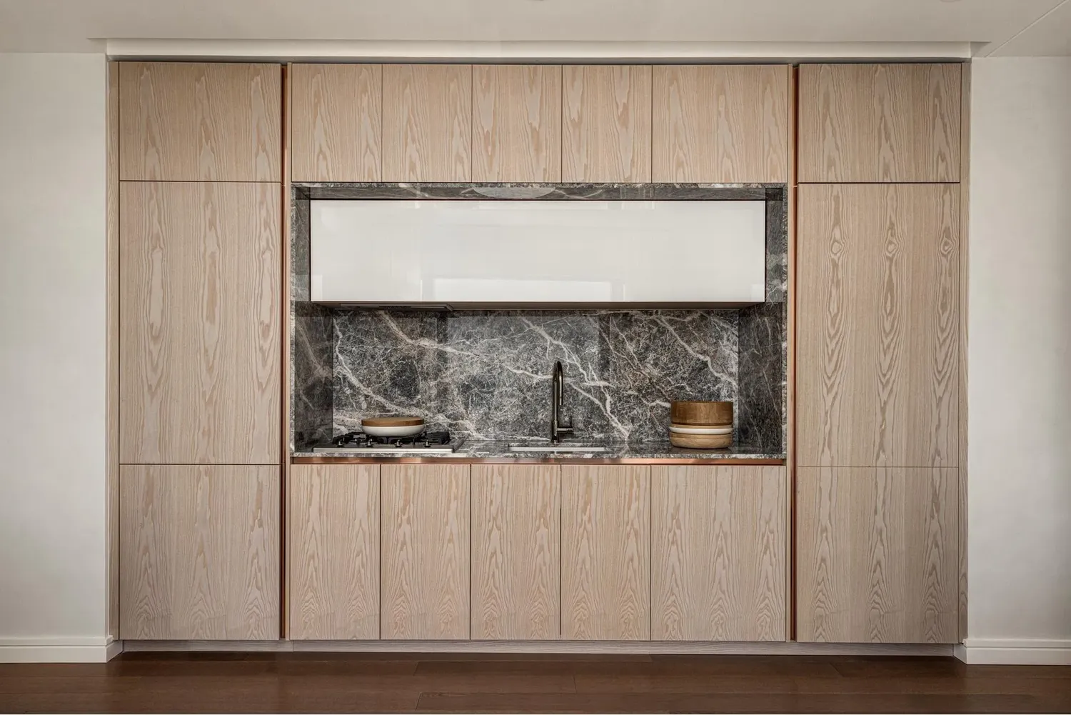 The expansive north facing primary bedroom features a wall of custom designed built in closets as well as a large dressing room. The custom designed primary en-suite bathroom features a wet room, floor-to-ceiling Covelano marble, radiant heated floors, a custom wall-mounted vanity and faucet, and medicine cabinet with recessed lighting. A Miele washer and dryer and a climate control thermostat completes this home.