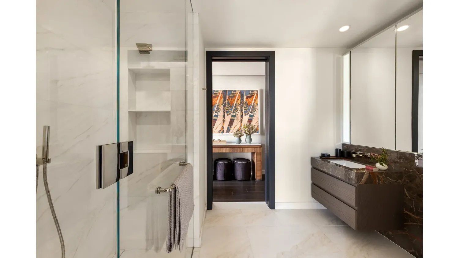 The bedroom, with pocket doors separating it from the living space, has a north facing window, ample closet space, and an en-suite bathroom. The custom designed primary bathroom features floor-to-ceiling Covelano marble, radiant heated floors, a custom wall-mounted vanity and faucet, and medicine cabinet with recessed lighting. A Miele washer and dryer and a climate control thermostat completes this home.