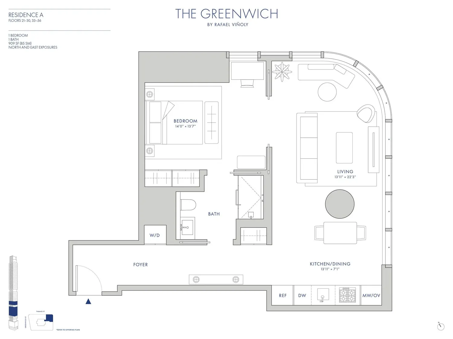 Welcome to Residence 56A at The Greenwich by Rafael Vinoly, where elevated living meets unparalleled views. This one-bedroom home boasts magnificent northern and eastern exposures through curved floor-to-ceiling windows, allowing ample natural light, and providing sweeping panoramas over Trinity Church towards the East River. The bedroom, off the living room, is separated by pocket doors creating a loft-like atmosphere. At 909 square feet, this home offers thoughtfully designed living spaces, with interior finishes crafted by the esteemed design firm, MAWD.