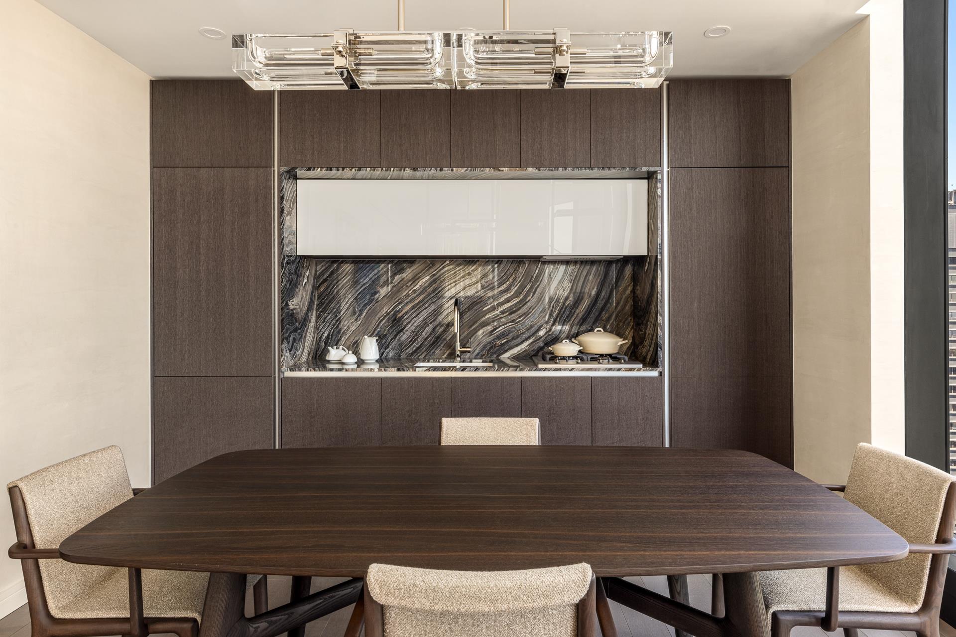 The formal entry foyer opens to the gracious living space, with 6" wide white oak flooring in dark brown finish. The custom designed kitchen features a full suite of Miele appliances, a vented hood, polished nickel fixtures, cabinets in walnut finish, and Ombra di Caravaggio marble countertops and backsplash.