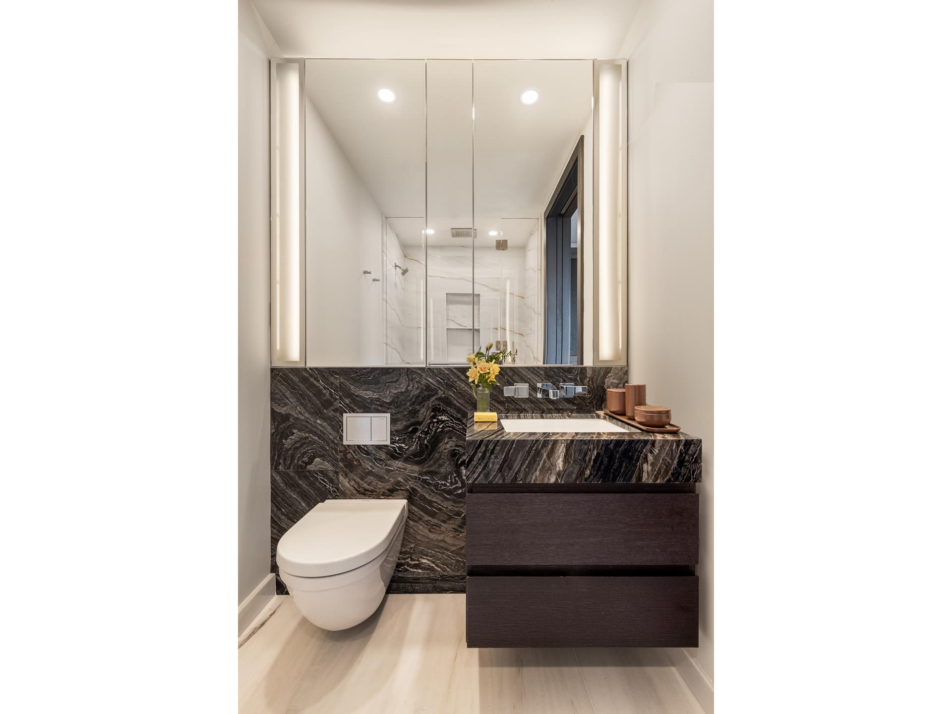 The bedroom, with pocket doors separating it from the living space, has a north facing window, ample closet space, and an en-suite bathroom. The custom designed primary bathroom features floor-to-ceiling Covelano marble, radiant heated floors, a custom wall-mounted vanity and faucet, and medicine cabinet with recessed lighting. A Miele washer and dryer and a climate control thermostat completes this home.